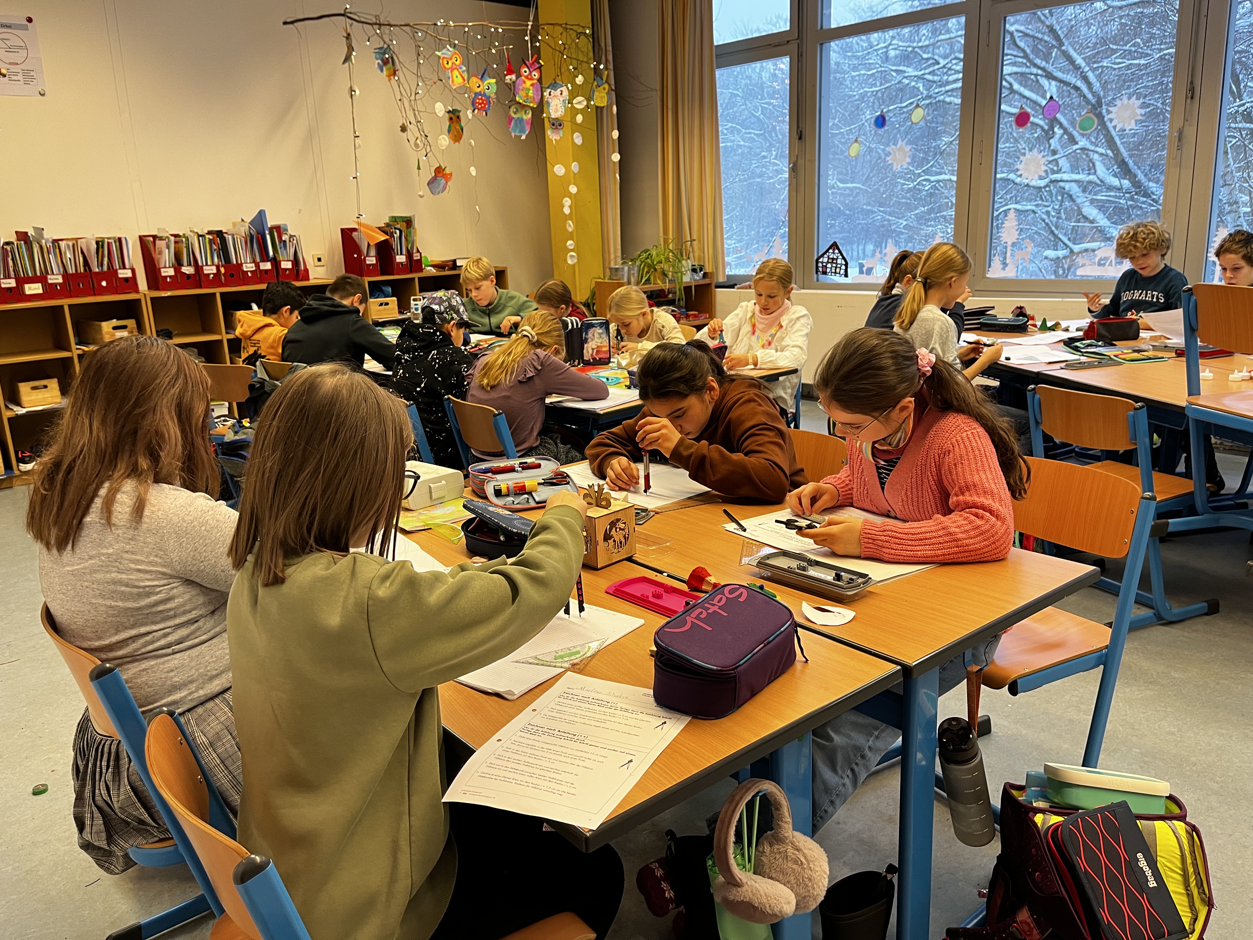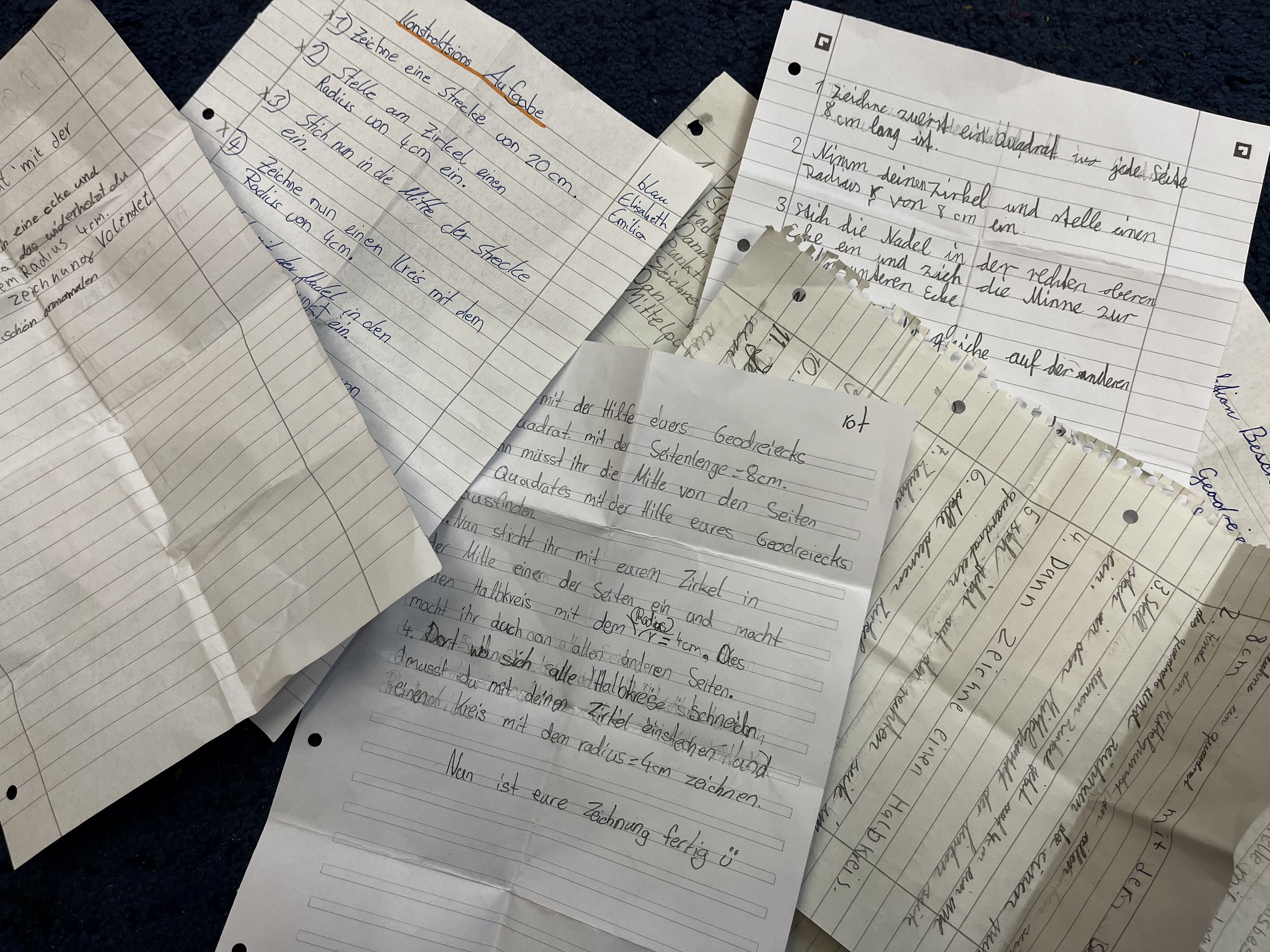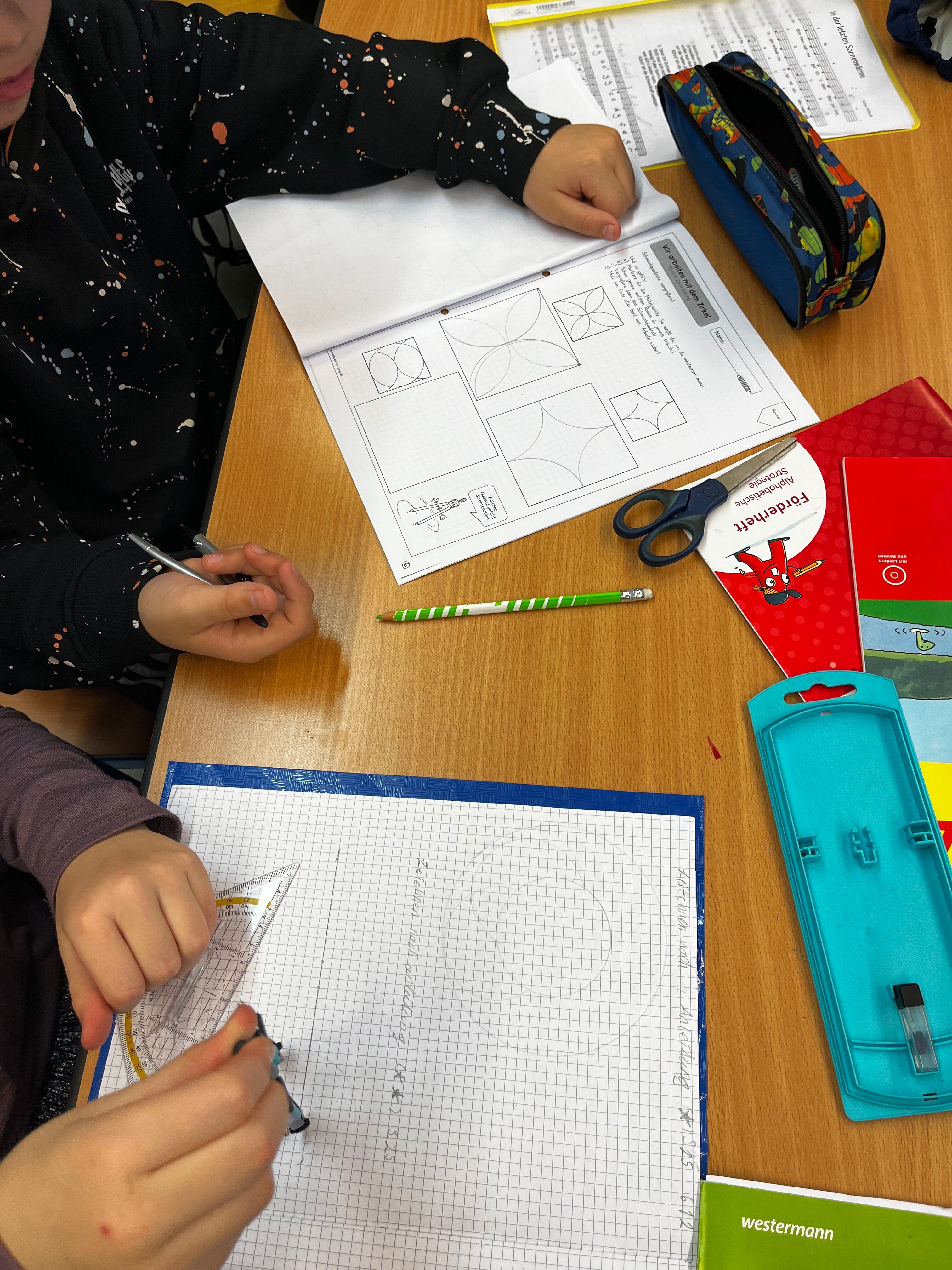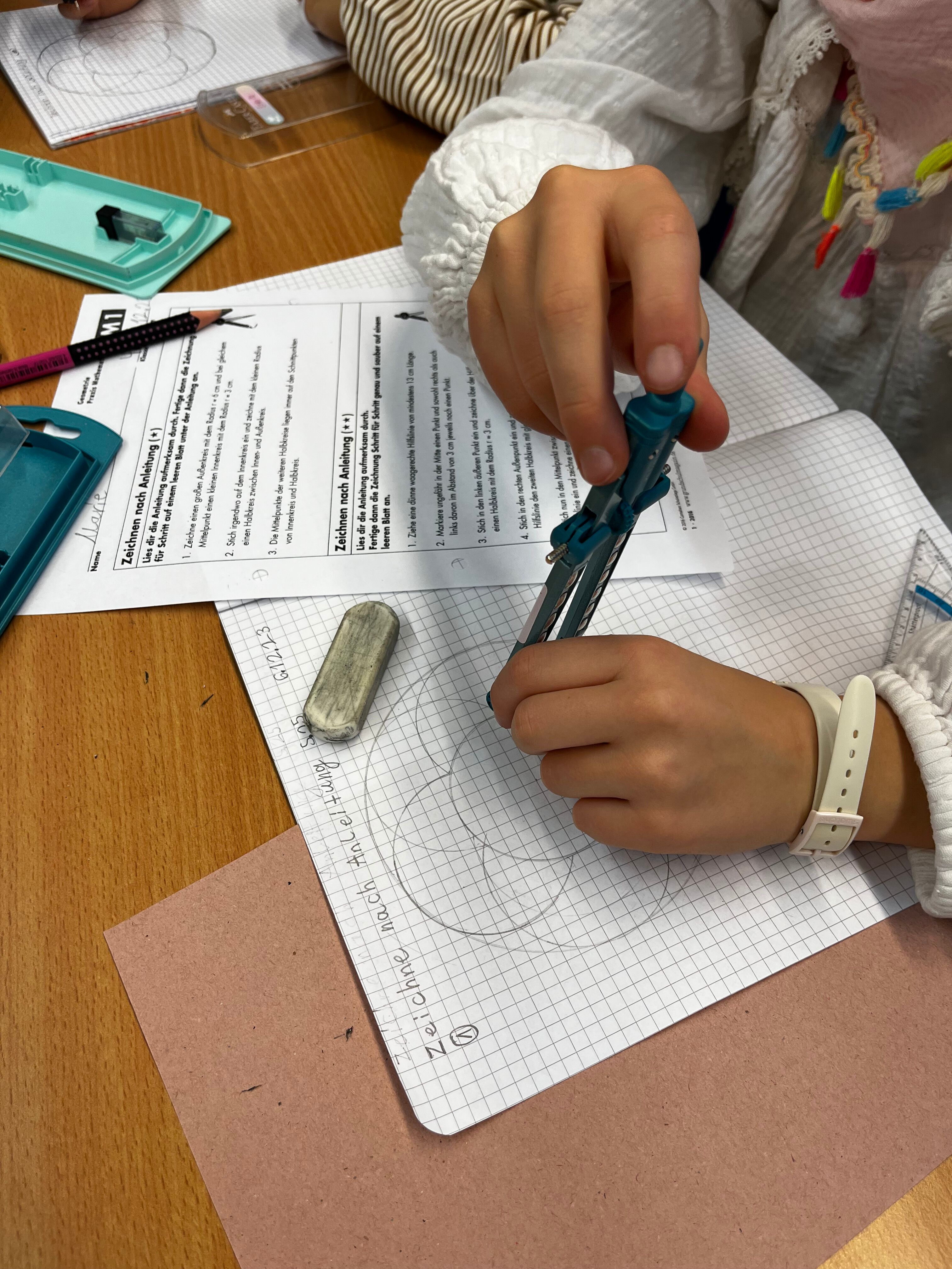 Unsere Lehrerin hat uns etwas mit dem Zirkel vorgemalt und die Zeichnungen sollten wir dann beschreiben. Manche haben leichte und manche haben etwas schwierigere Aufgaben bekommen.