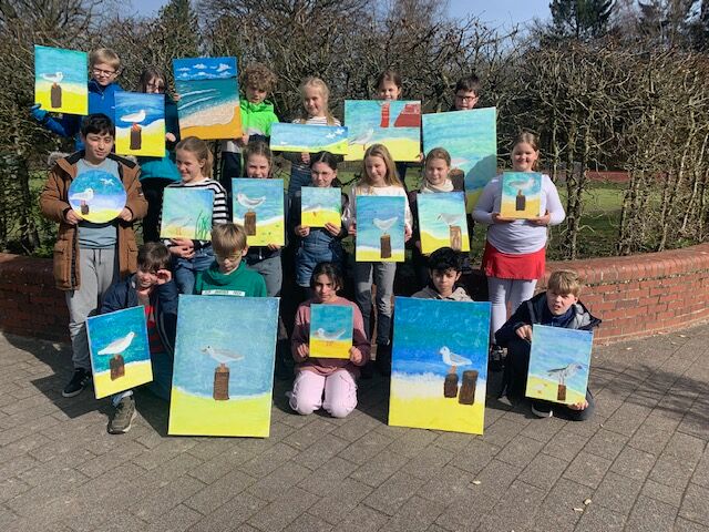 Es bereitet immer wieder Spaß Möwen am Meer zu beobachten und so sind die besonderen Vögel für Fotografen und Maler ein beliebtes Motiv. Im Rahmen des Sachunterrichts entstanden diese unterschiedlichen Möwenbilder auf Acryl. Übereinstimmend stellten die Kinder fest: „Richtig schön ist es erst, wenn wir sie alle zusammenstellen. Dann kann man sich das Gekreische am Meer gut vorstellen.“