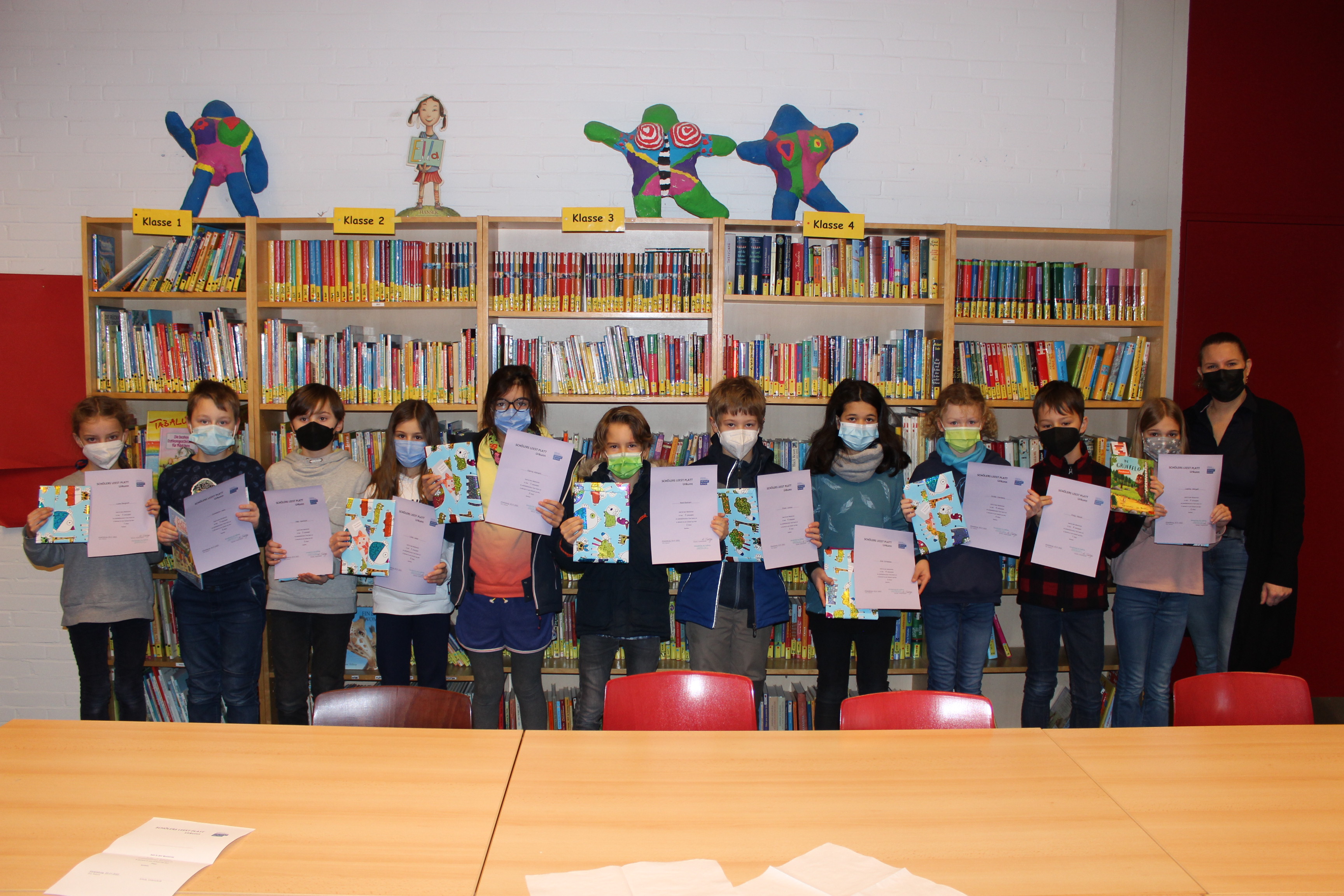 Nachdem in den 3. und 4. Klassen die besten Schülerinnen und Schüler im Plattdeutsch vorlesen ermittelt wurden, fand der Schulausscheid am Donnerstag, 20.01.2022, in der Bibliothek statt.