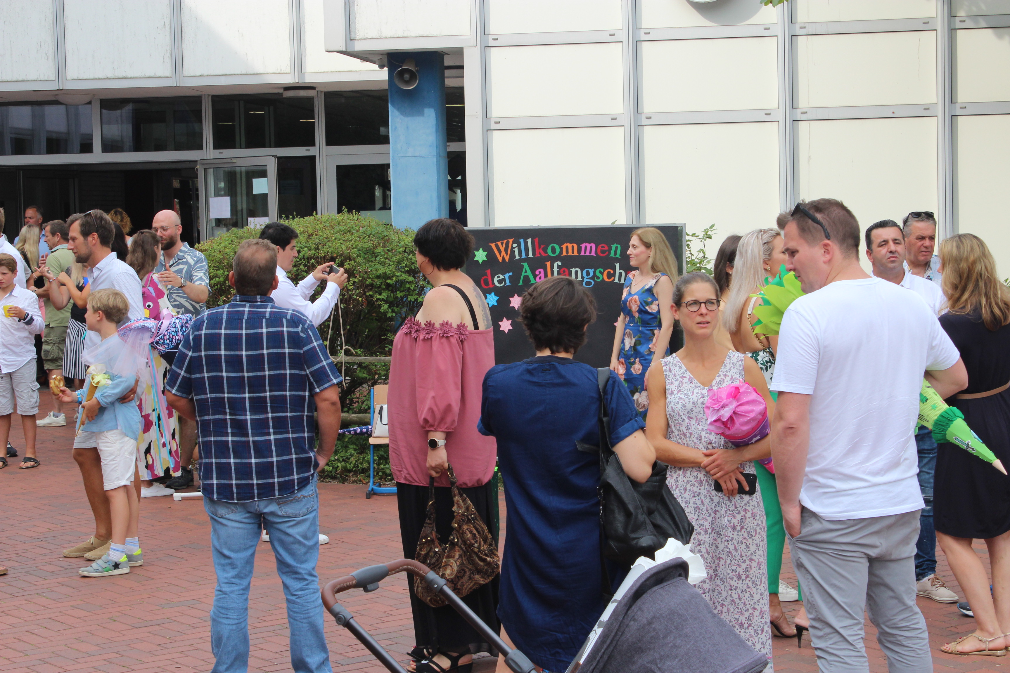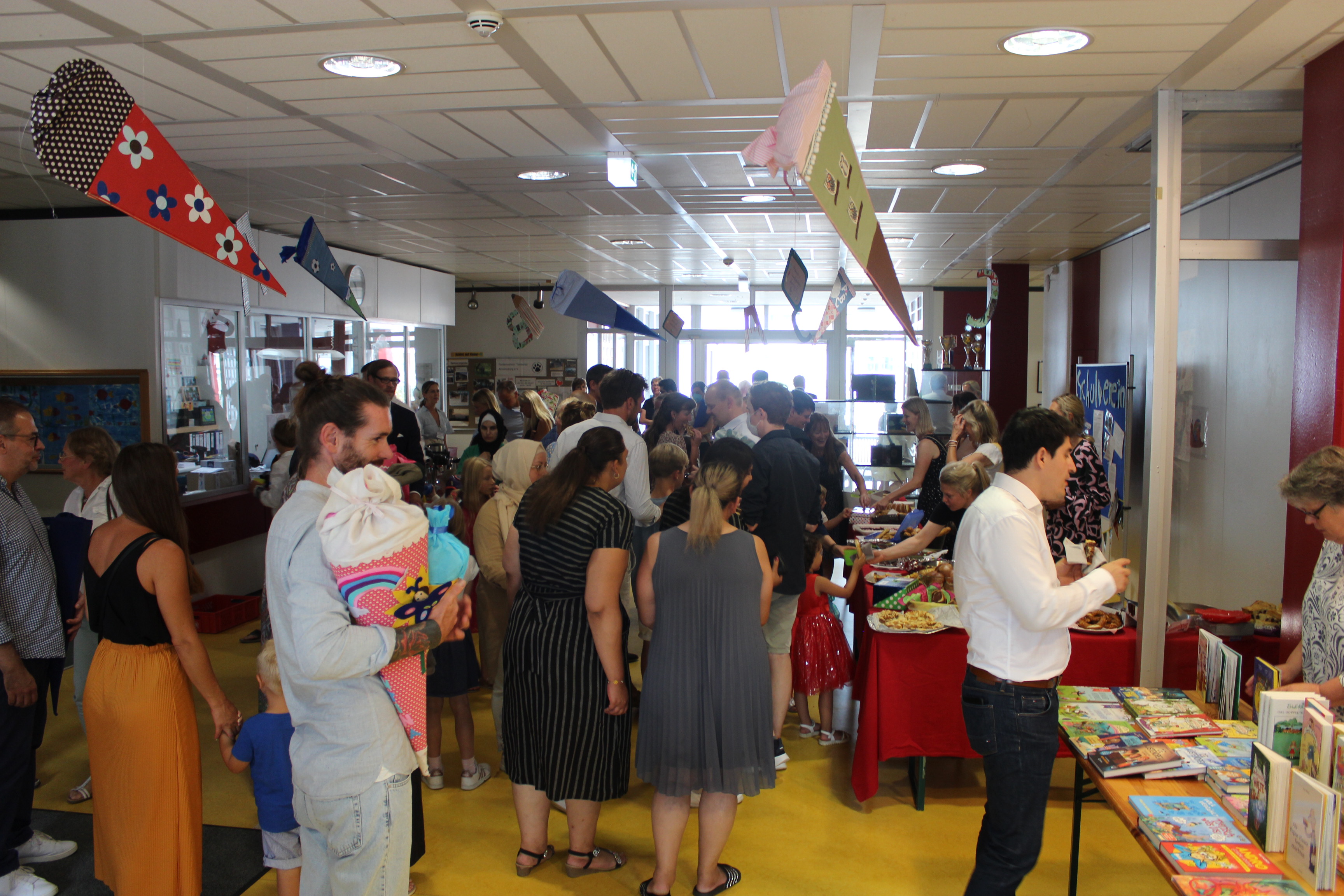 Nach dem Aufrufen aller Kinder, gingen die Klassen in ihre Klassenräume und Schulleiter Roman Tietze gab in einem zweiten Teil der Begrüßung noch einige wichtige Informationen bekannt. Im Anschluss verkürzten sich die wartenden Eltern die Zeit bei Kaffee und Kuchen und der Möglichkeit ein neu gekauftes Buch an die Schülerbücherei zu spenden, wie immer gut organisiert durch den Schulverein. Bald darauf kamen die Schulanfängerinnen und Schulanfänger aus ihren Klassenräumen und Fotografieren und Filmen war angesagt.