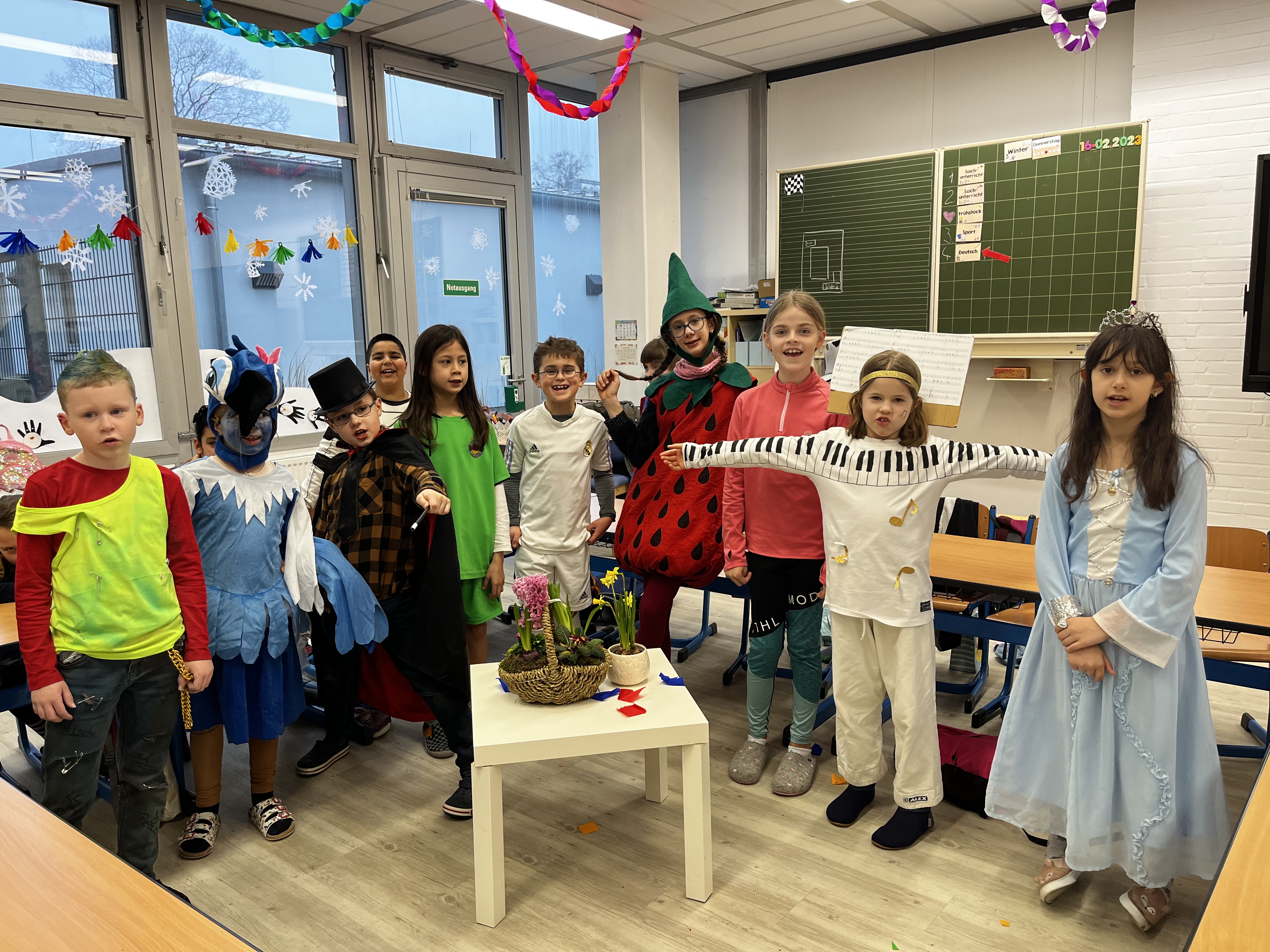 Der Tag war echt sehr witzig und sehr toll. Zuerst sind alle Klassen in die Turnhalle gegangen, wo wir getanzt haben. Danach haben wir eine Polonaise durch die Schule gemacht. Und dann sind wir alle wieder in unsere Klassen gegangen und haben Spiele gespielt. Wir hatten auch ein Büffet, wo jeder aus unserer Klasse etwas mitgebracht hat. Nachher durfte jede Klasse 20 Minuten auf die Bewegungslandschaft. Die war richtig toll. Danach waren wir in der Pause. Und dann war die Faschingsfeier leider schon zu Ende, aber es war die tollste Faschingsfeier, die wir je erlebt haben. Und wenn es nach uns gehen würde, wäre so eine Feier jeden Tag.