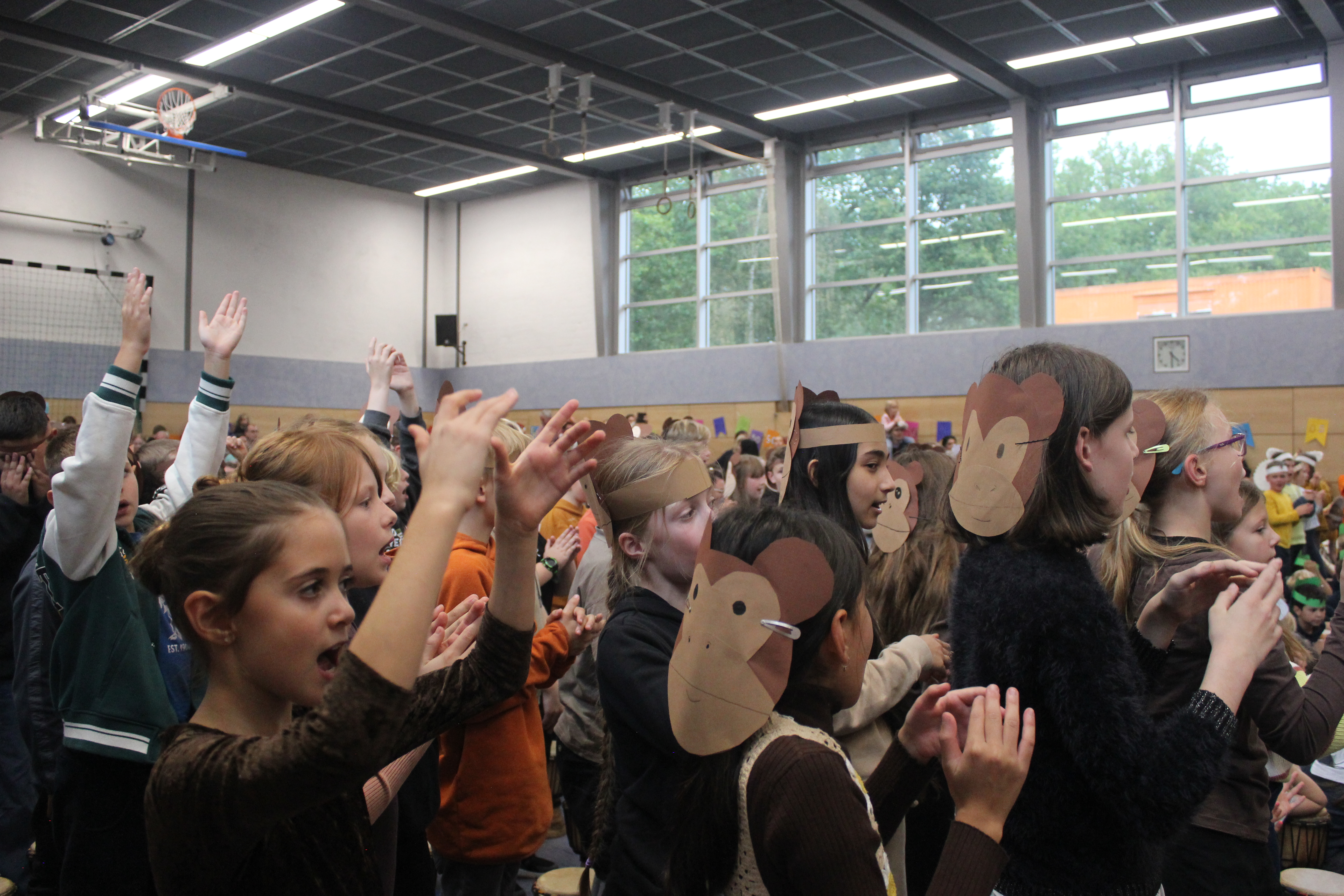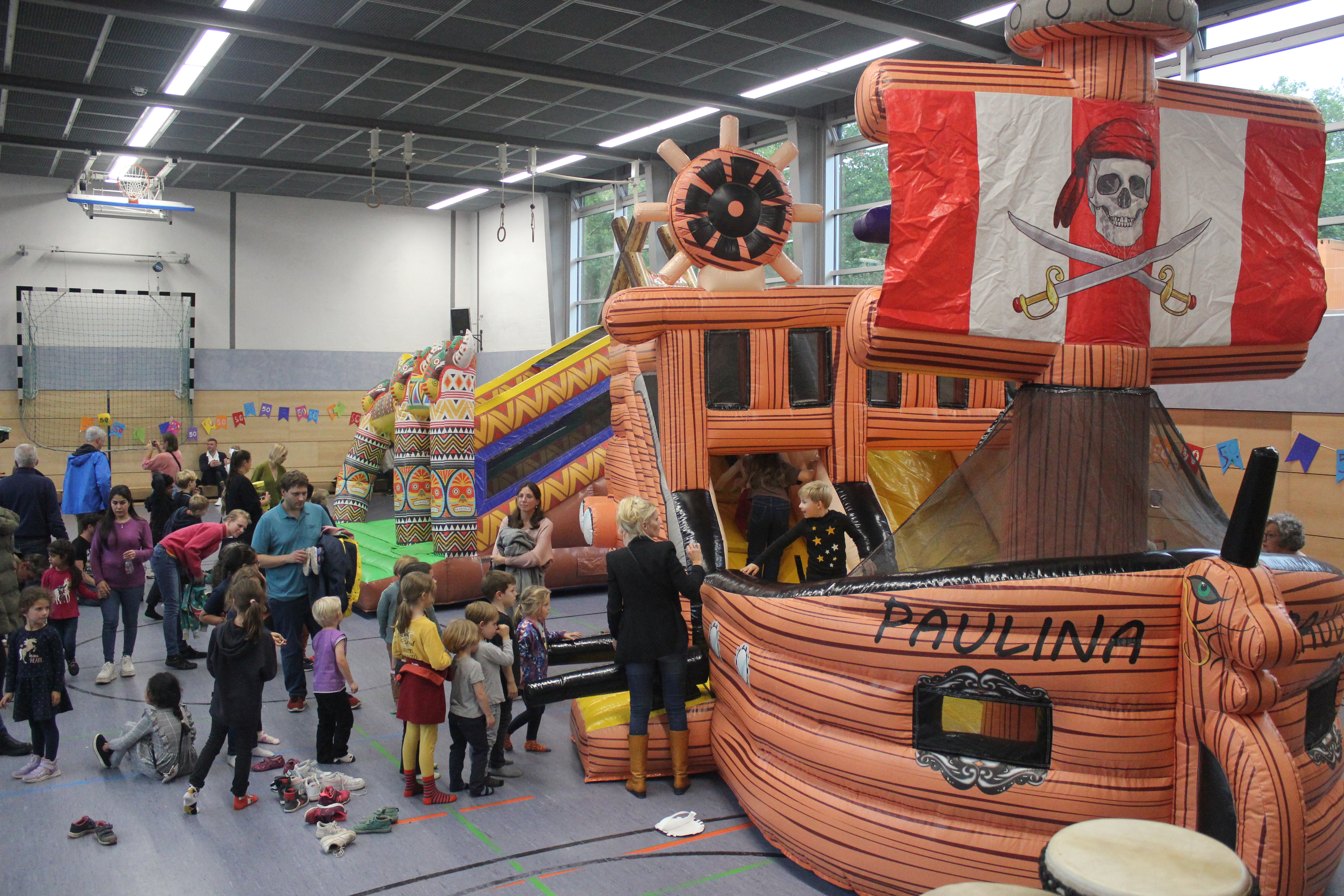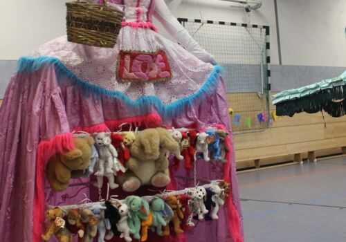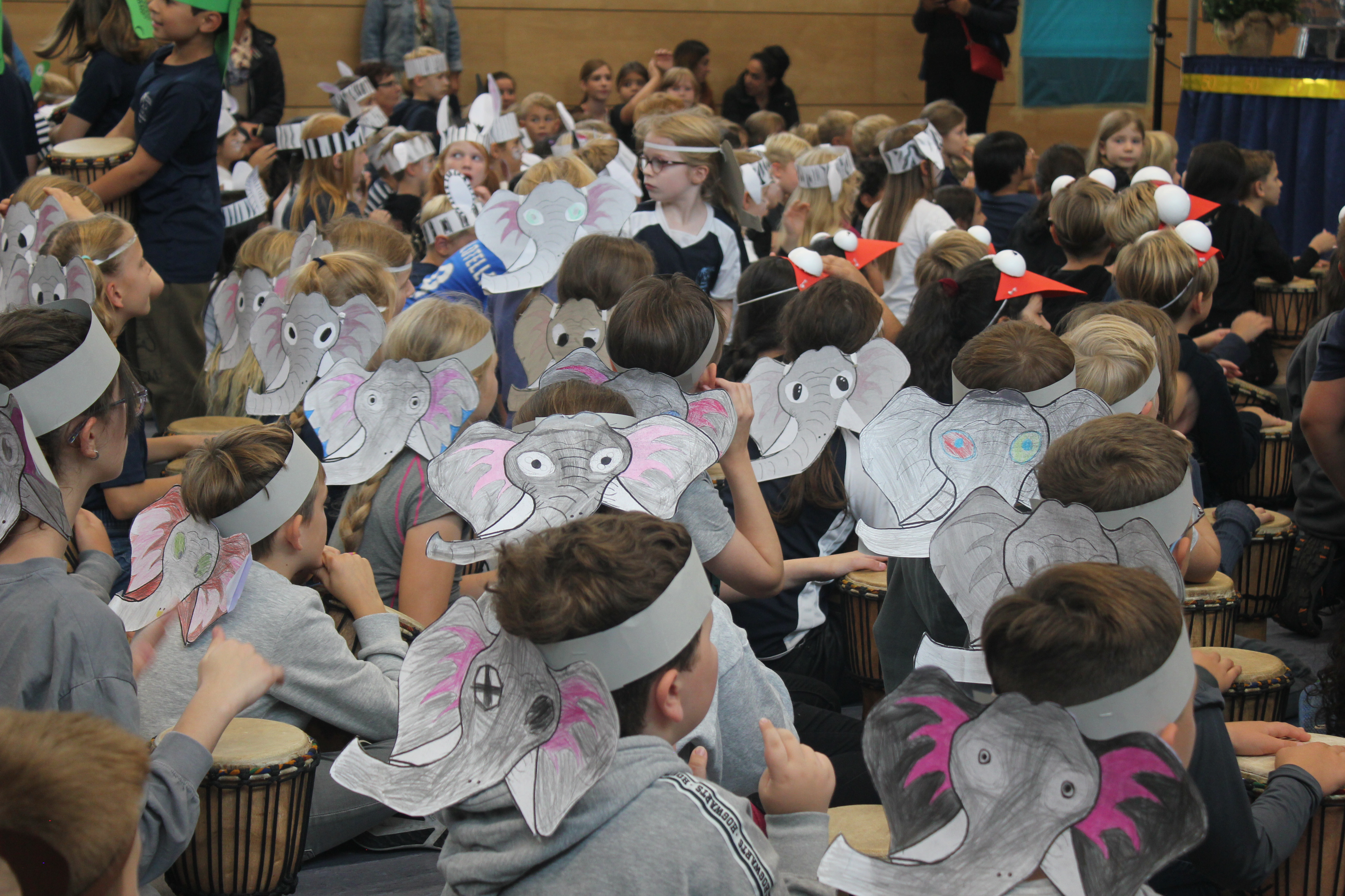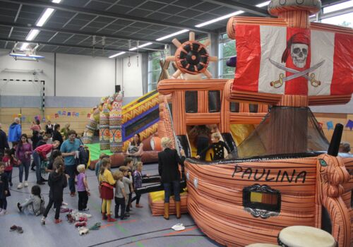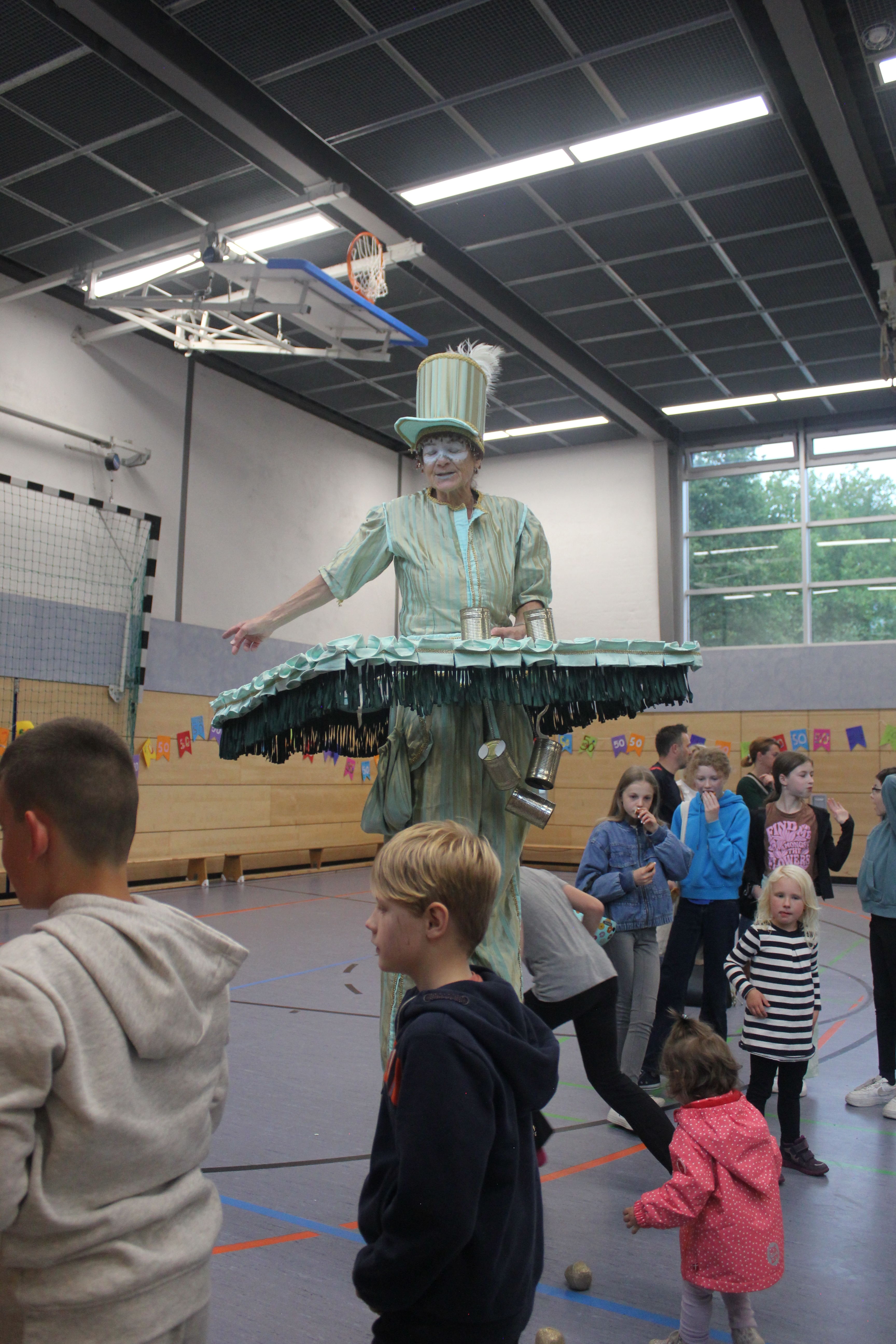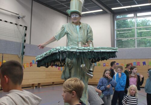 Am Nachmittag ging es ab 16.00 Uhr mit dem Schulfest weiter. Es begann mit einem trommelnden Auftakt durch das Projekt “Trommelapplaus“. Alle Schülerinnen und Schüler zeigten, was sie in knapp drei Schultagen auf einer Djembe so alles gelernt haben. Im Anschluss präsentierte WABE Nord e.V., als Träger der Offenen Ganztagsschule (OGS) weitere Aktivitäten, wie Schminken, kleine Drachen, Schlüsselanhänger, Rasseln basteln oder einen eigenen Button herstellen. In der Turnhalle konnten sich die Kinder auf zwei großen Hüpfburgen austoben und zwei riesige Stelzenläuferinnen in historischen Kostümen bestaunen.