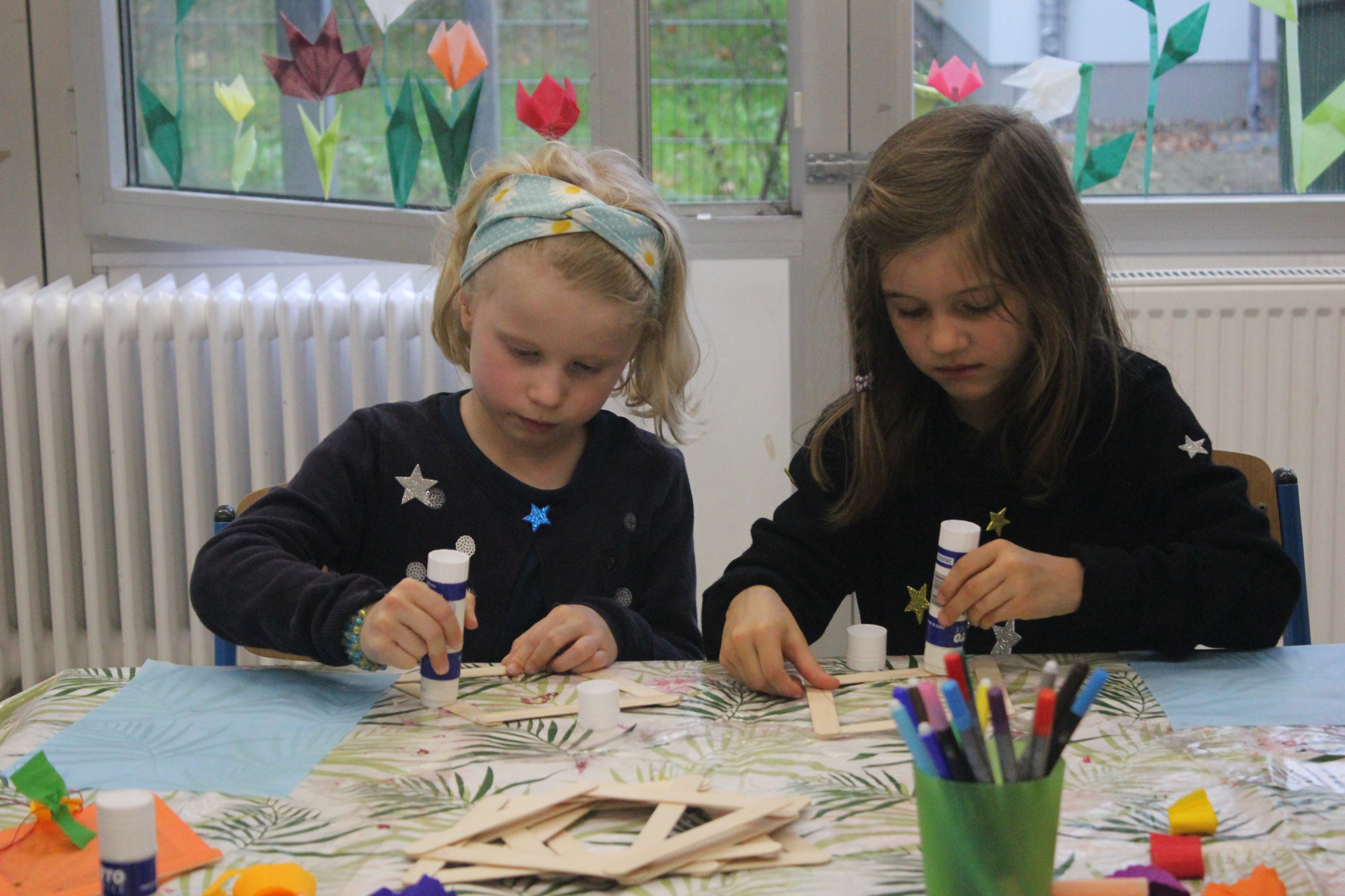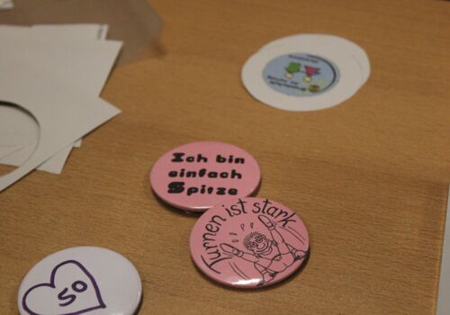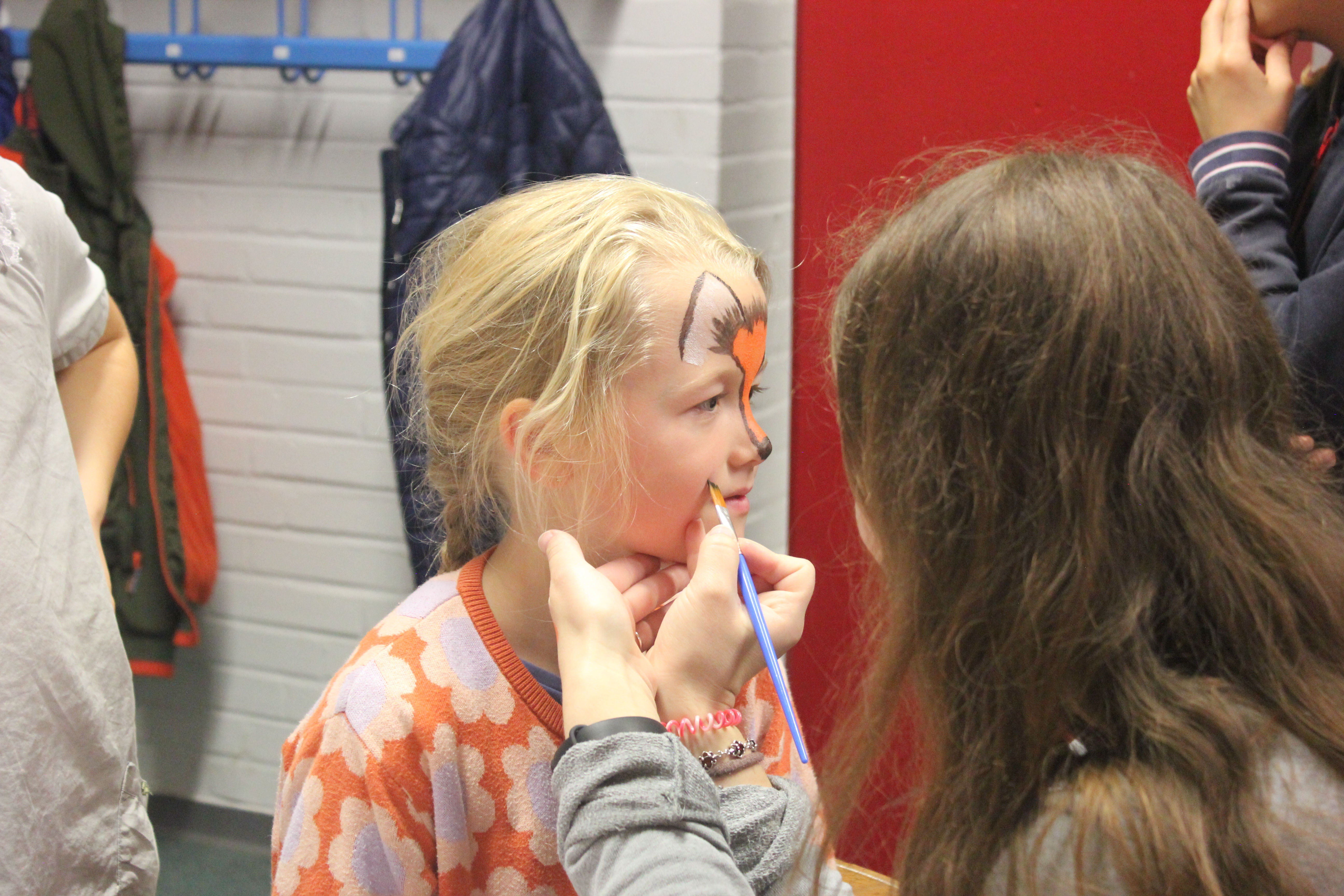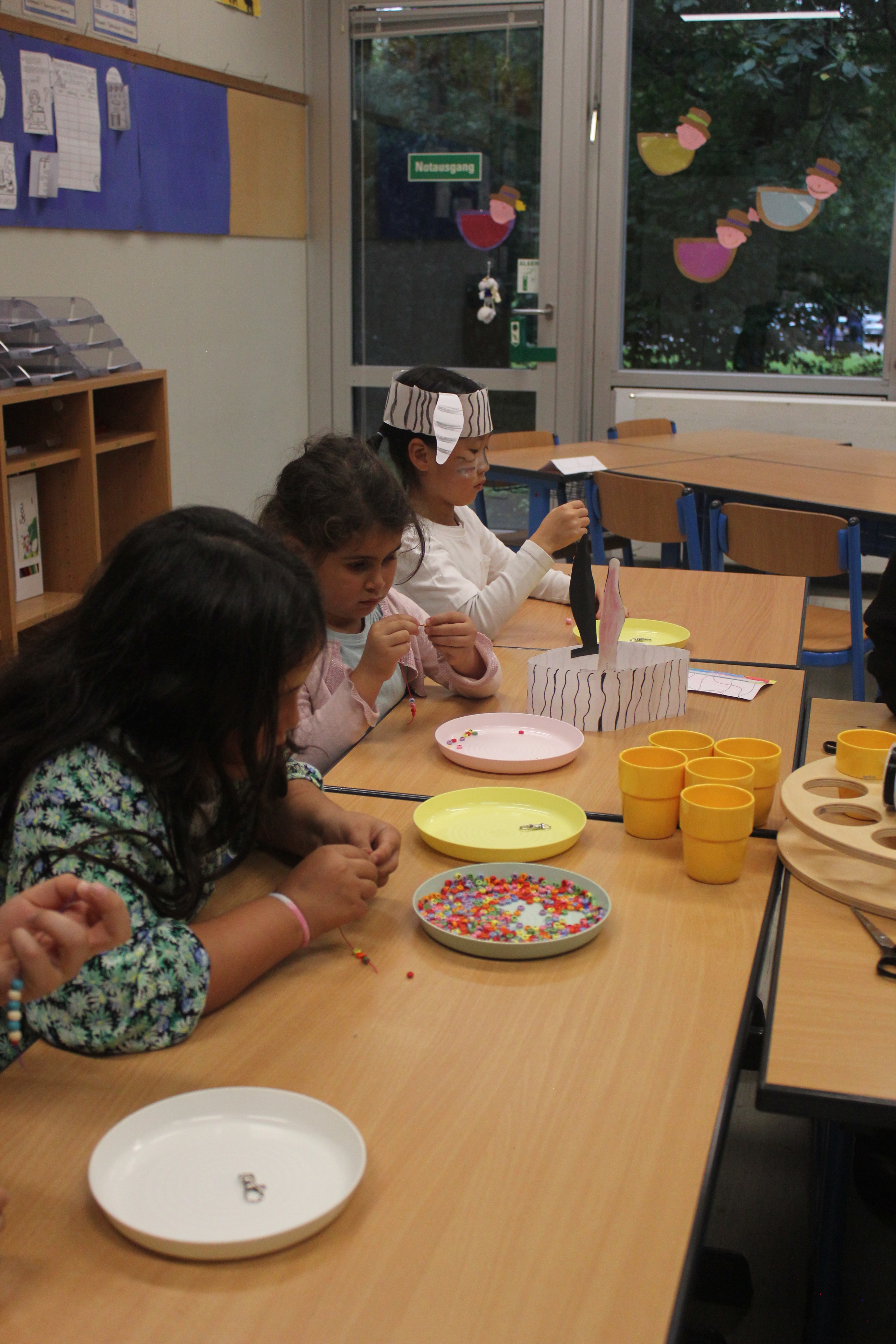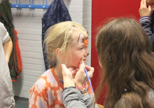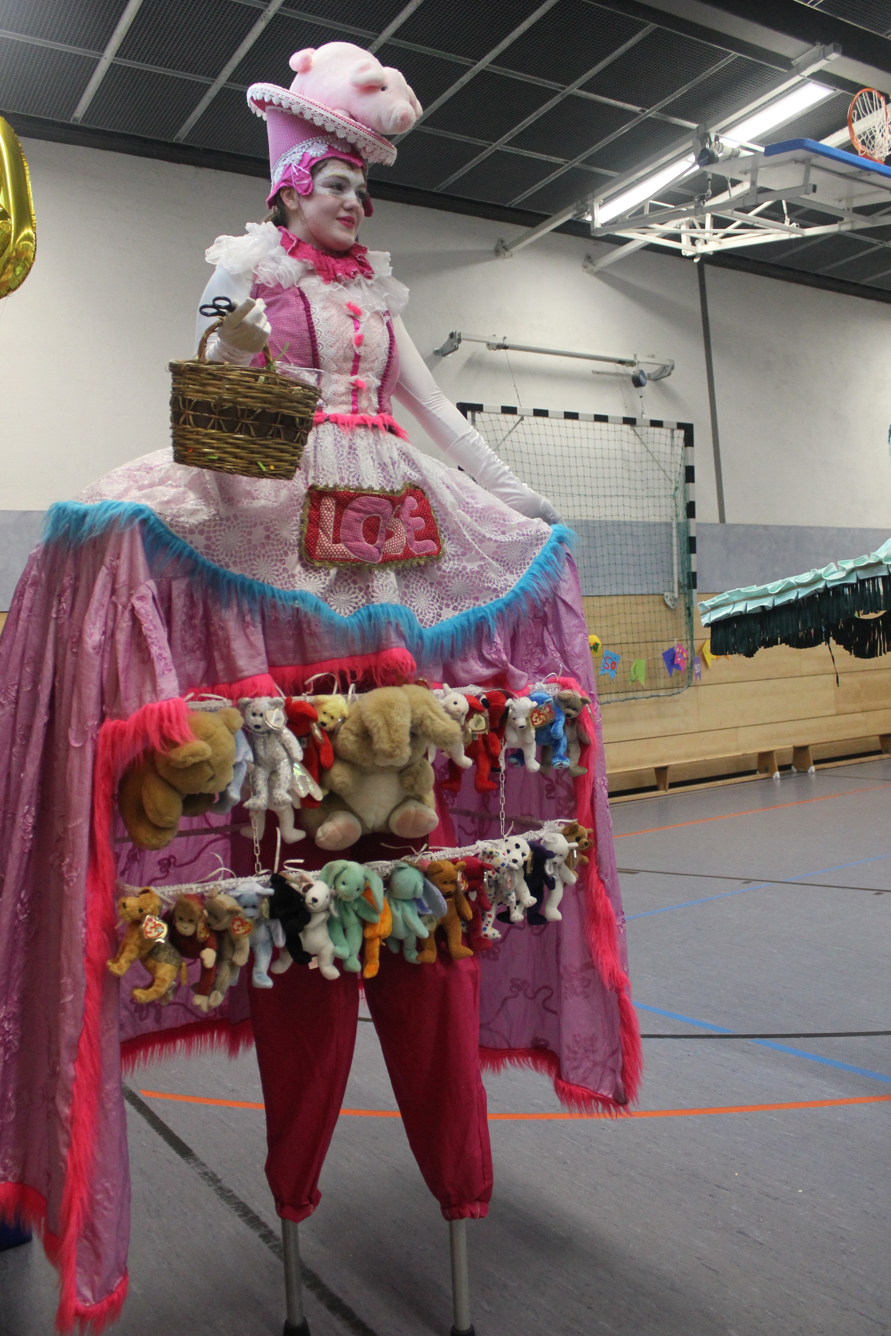 Am Nachmittag ging es ab 16.00 Uhr mit dem Schulfest weiter. Es begann mit einem trommelnden Auftakt durch das Projekt “Trommelapplaus“. Alle Schülerinnen und Schüler zeigten, was sie in knapp drei Schultagen auf einer Djembe so alles gelernt haben. Im Anschluss präsentierte WABE Nord e.V., als Träger der Offenen Ganztagsschule (OGS) weitere Aktivitäten, wie Schminken, kleine Drachen, Schlüsselanhänger, Rasseln basteln oder einen eigenen Button herstellen. In der Turnhalle konnten sich die Kinder auf zwei großen Hüpfburgen austoben und zwei riesige Stelzenläuferinnen in historischen Kostümen bestaunen.