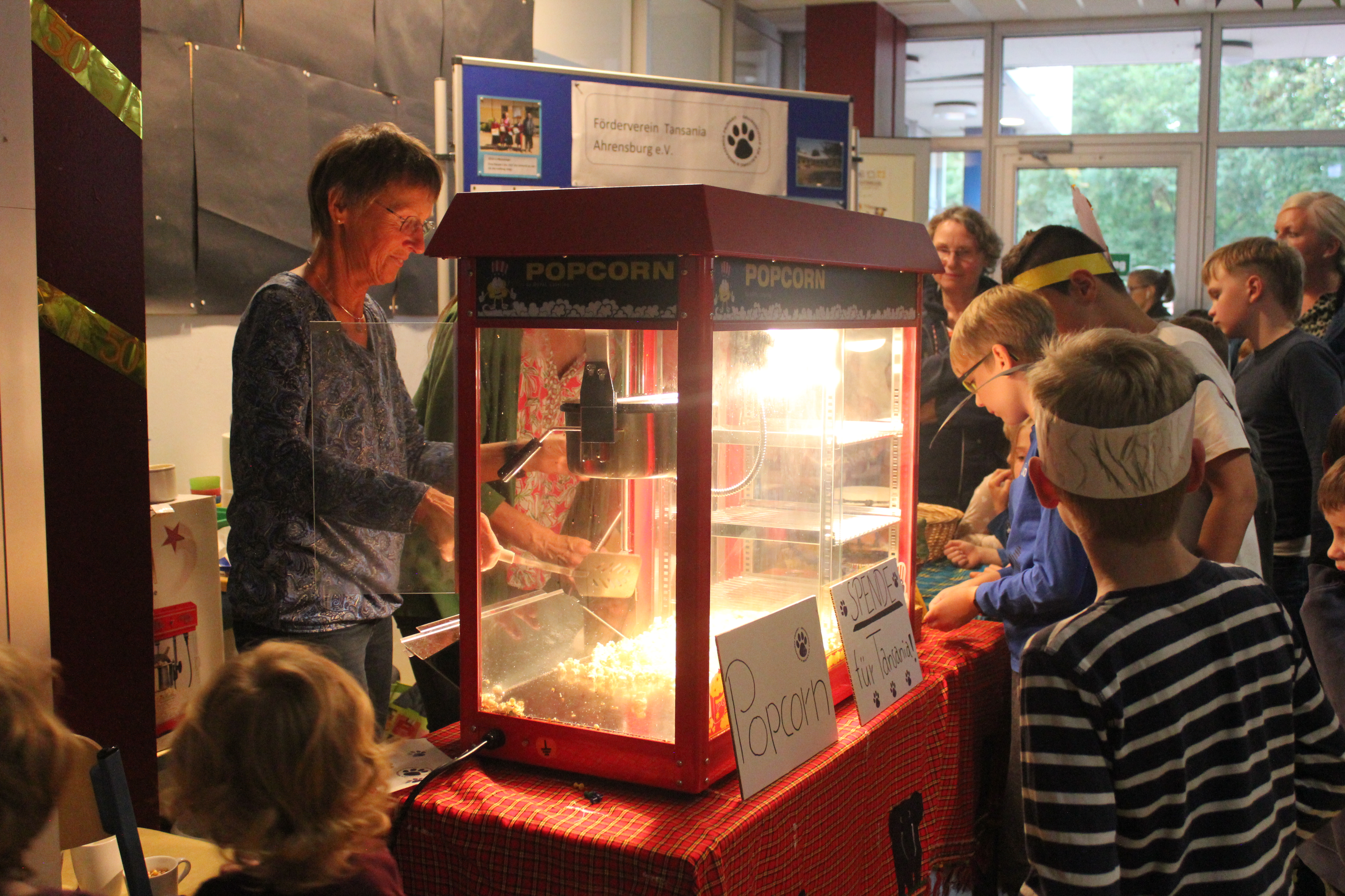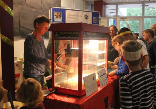 Für das leibliche Wohl sorgte am Nachmittag der Schulverein, wieder in der Cafeteria, mit reichlich Kuchenspenden der Eltern. Wer es herzhaft mochte, konnte Hot Dogs verspeisen. Popcorn durfte nicht fehlen. Dies übernahm der Tansania-Verein, der über viele Jahre mit Initiativen der Aalfangschule eine Primarschule in Nkoasenga in Tansania beim Aufbau unterstützte.