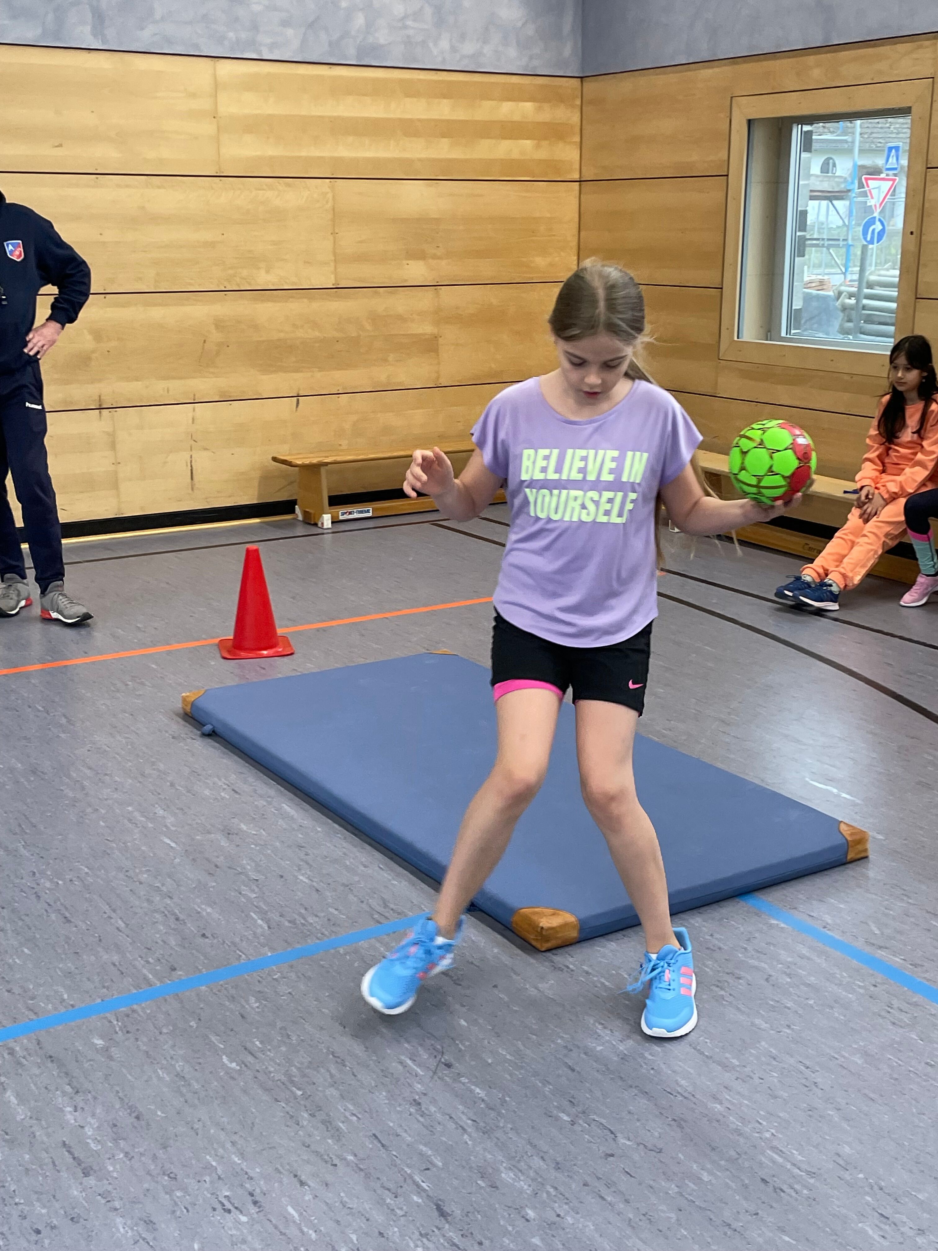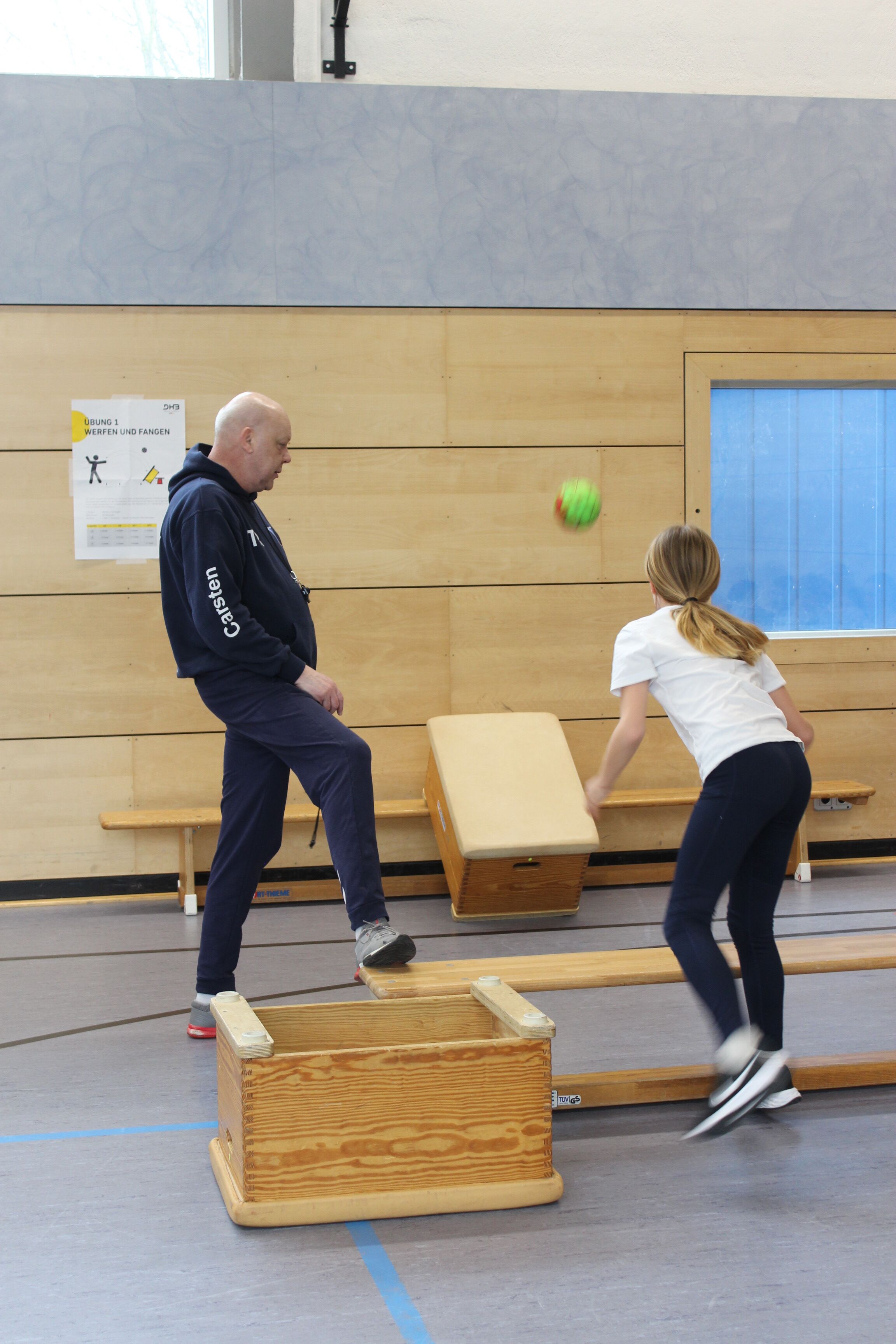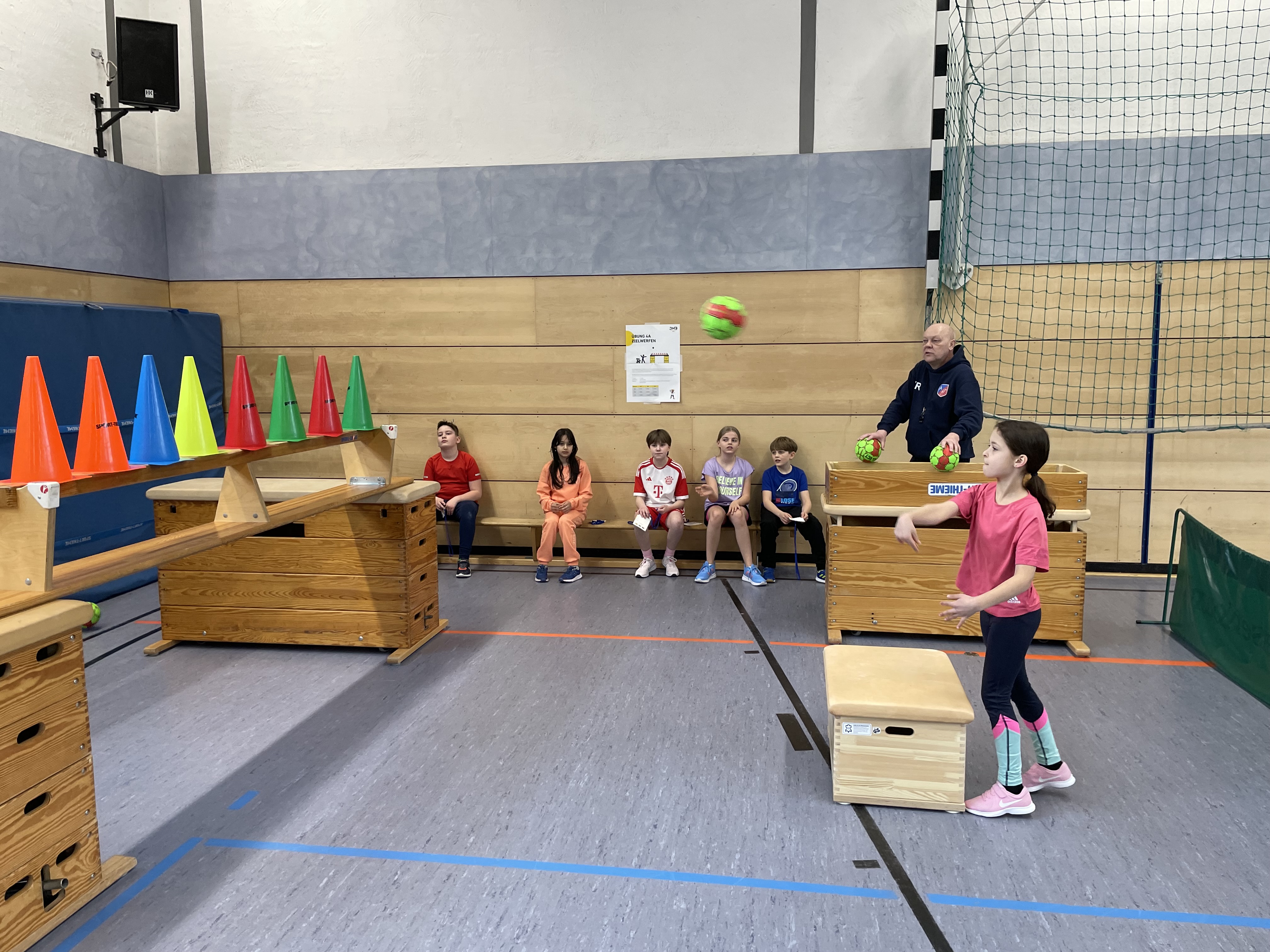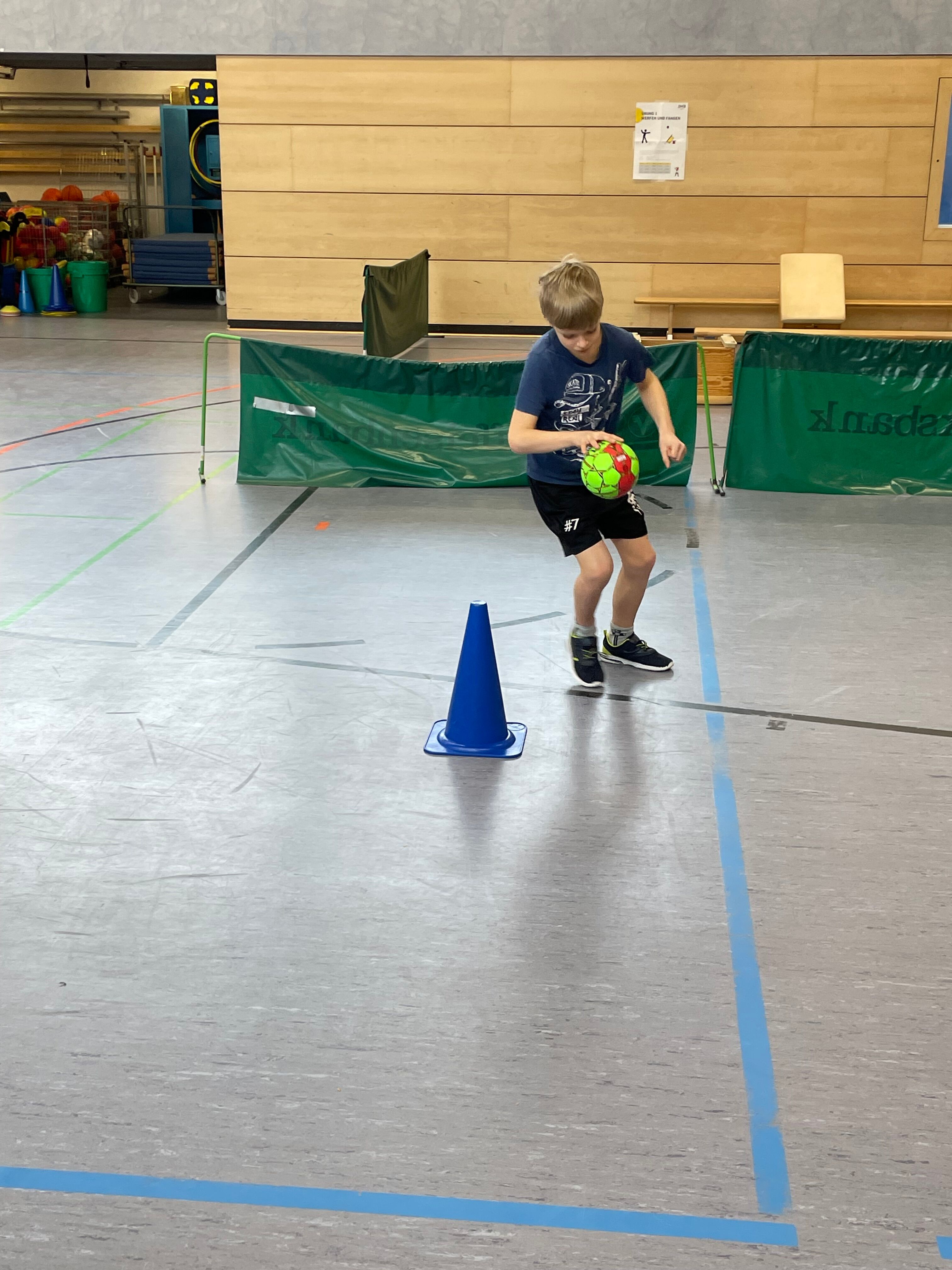 Die Kinder absolvierten in ihrer Klasse in einer Sportstunde vielseitige Übungen mit einem Handball. Da mussten Hütchen mit dem Handball abgeworfen werden. Der Ball musste in unterschiedlicher Laufbewegung transportiert werden. Es wurde geprellt, hochgeworfen (dabei geklatscht) und wieder aufgefangen und es wurden Abpraller von einem kleinen Turnkasten aufgefangen.