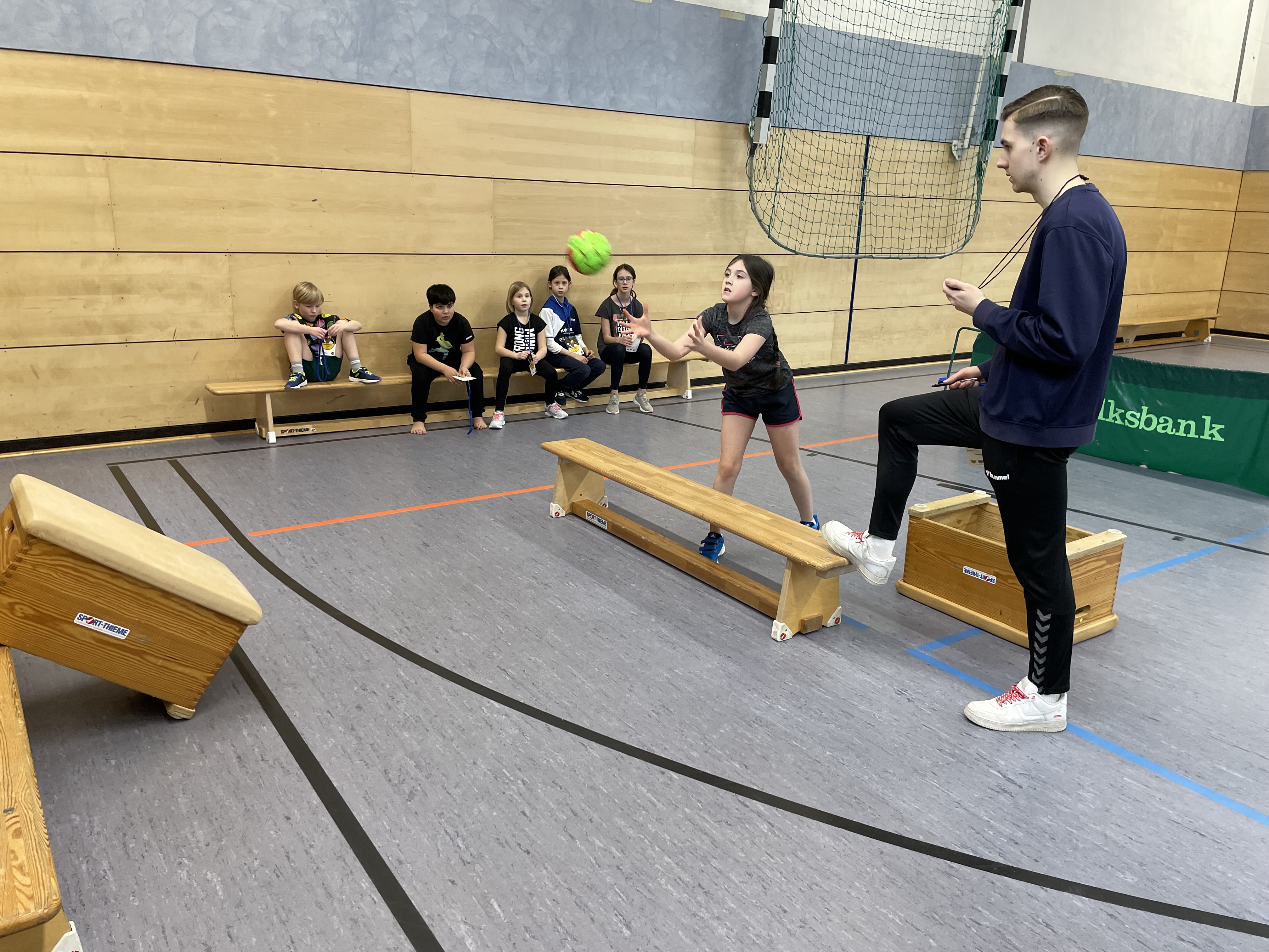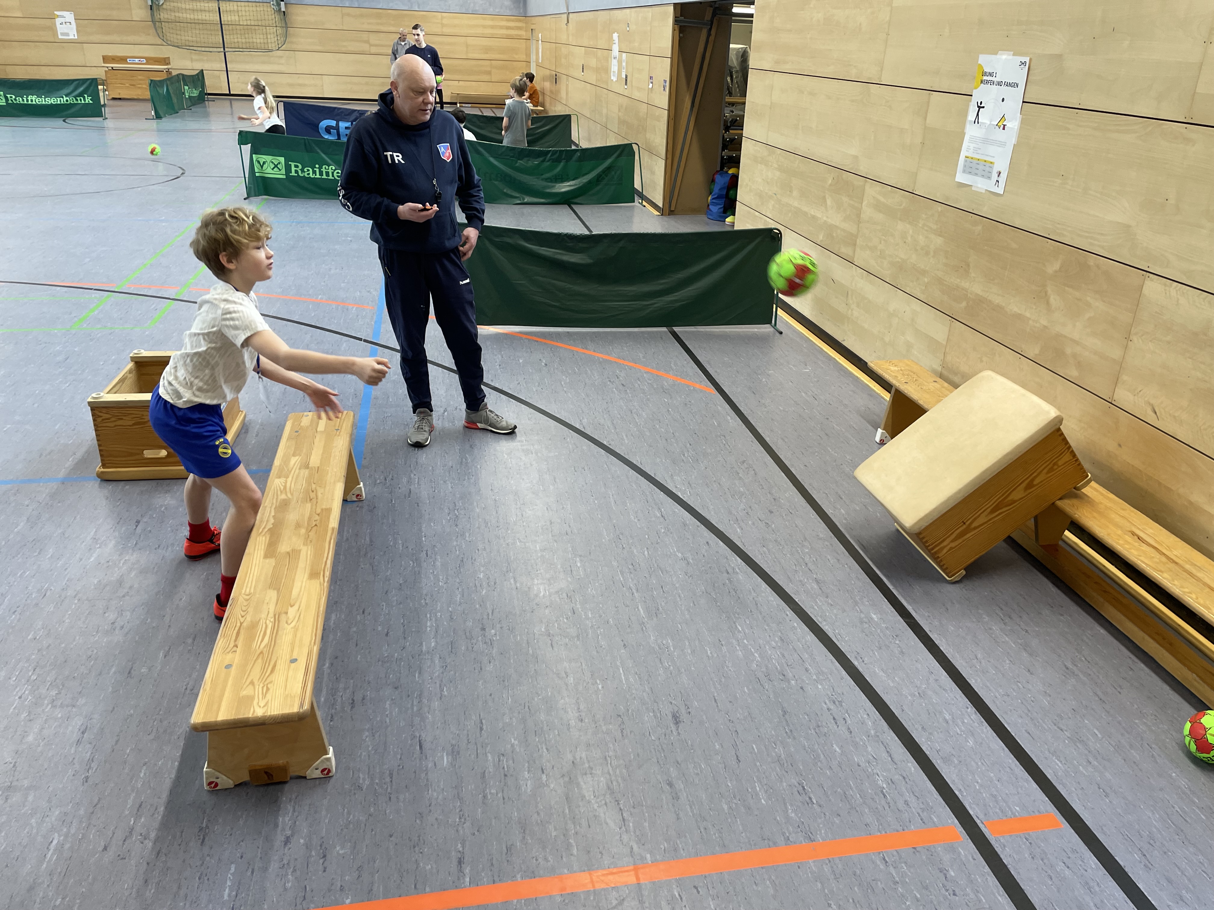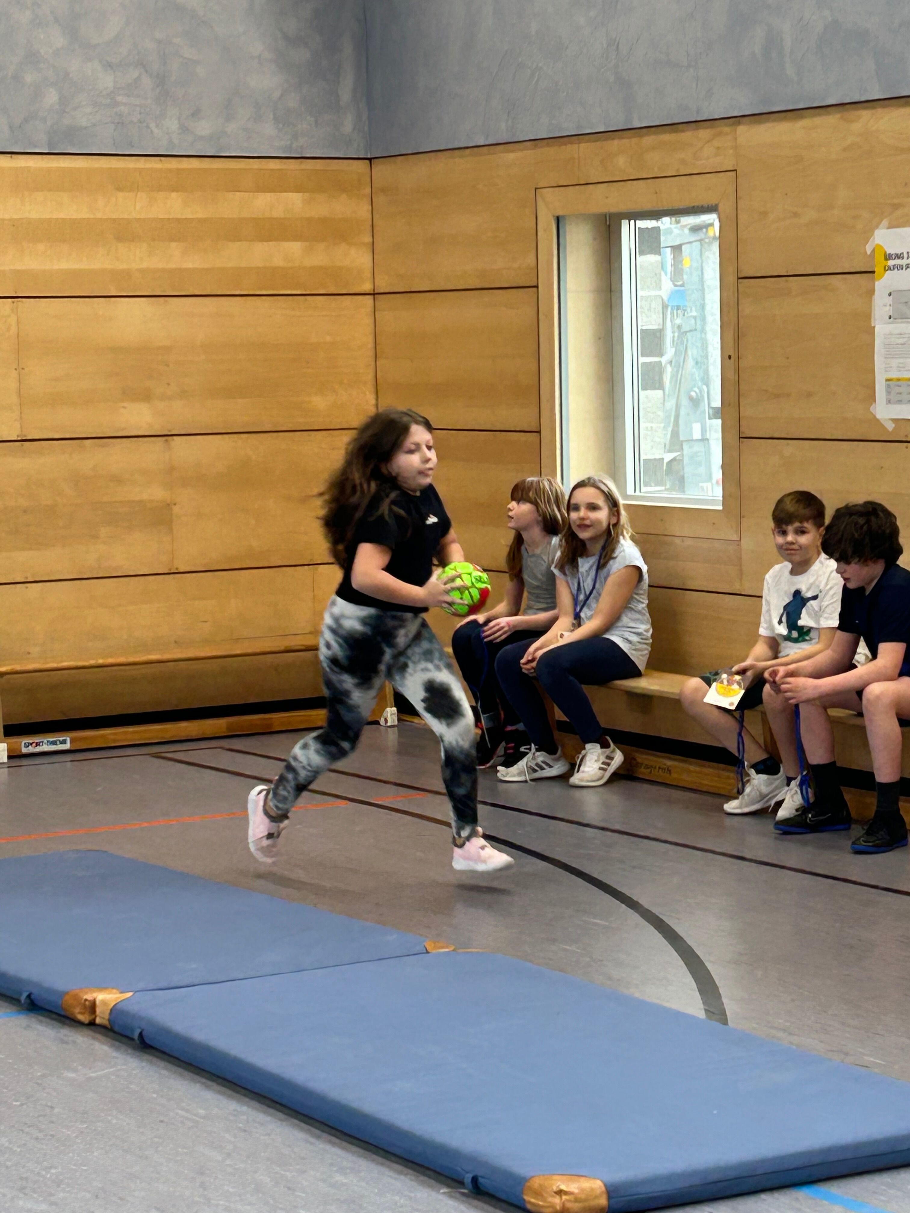 Die Kinder absolvierten in ihrer Klasse in einer Sportstunde vielseitige Übungen mit einem Handball. Da mussten Hütchen mit dem Handball abgeworfen werden. Der Ball musste in unterschiedlicher Laufbewegung transportiert werden. Es wurde geprellt, hochgeworfen (dabei geklatscht) und wieder aufgefangen und es wurden Abpraller von einem kleinen Turnkasten aufgefangen.