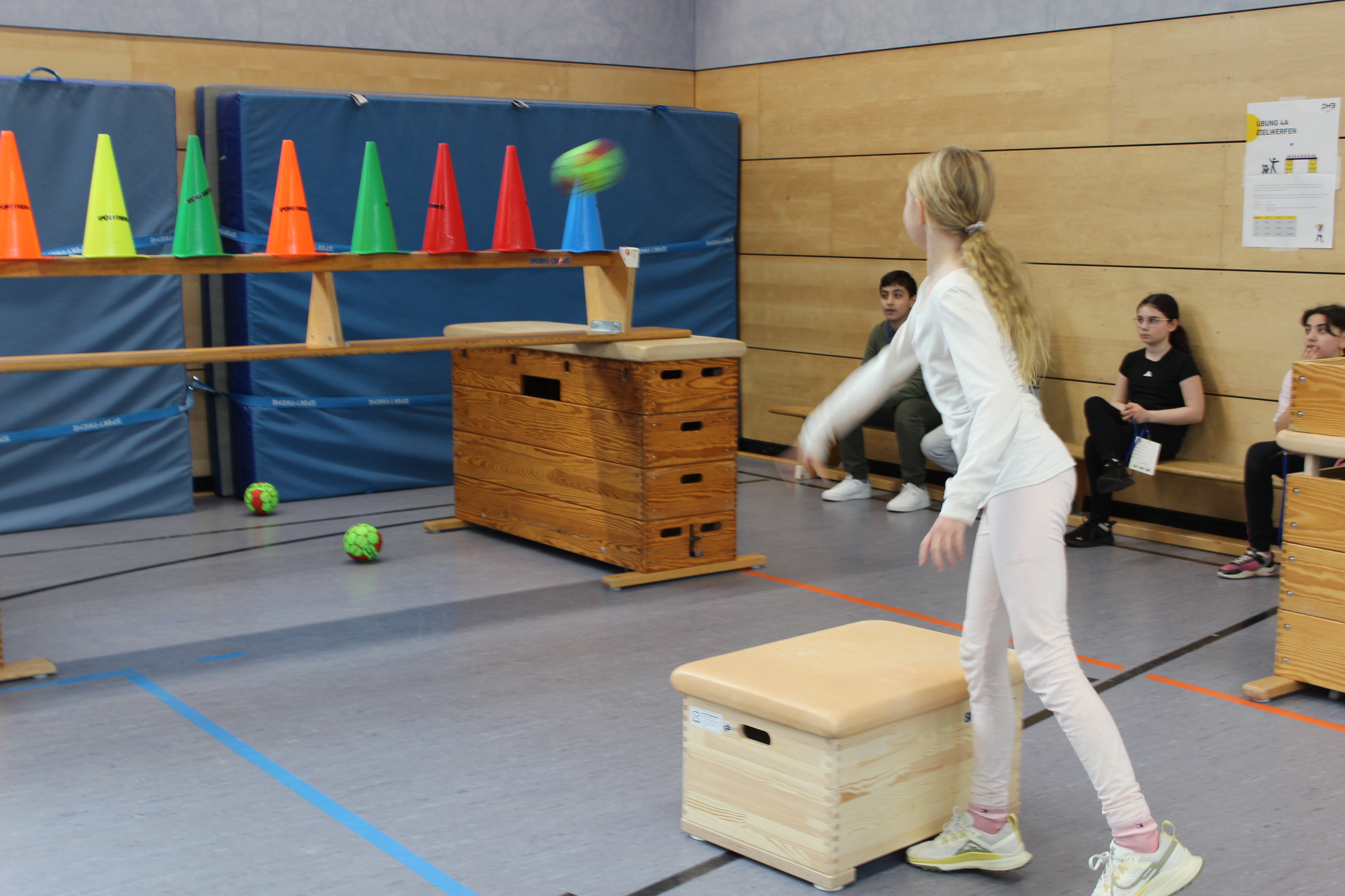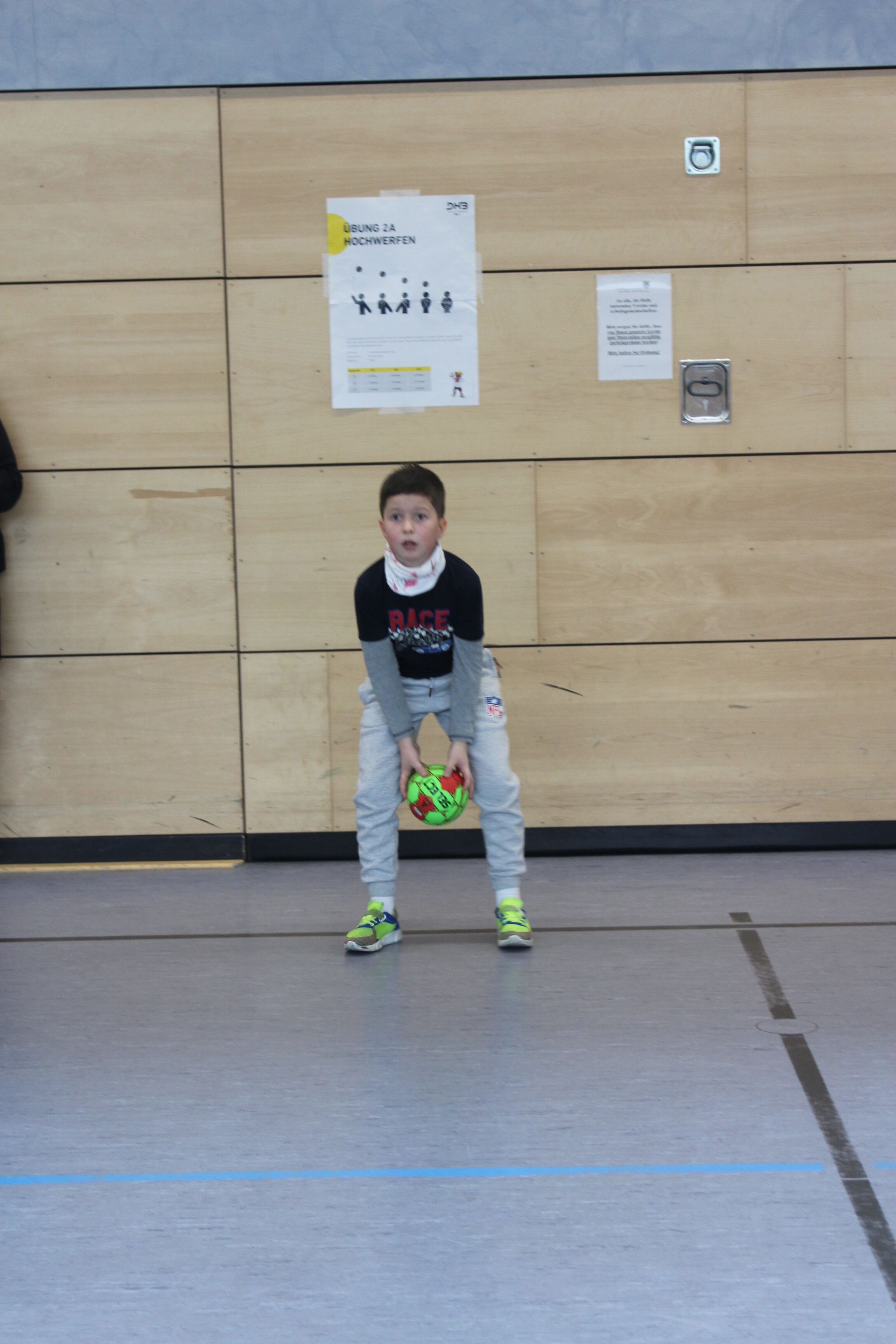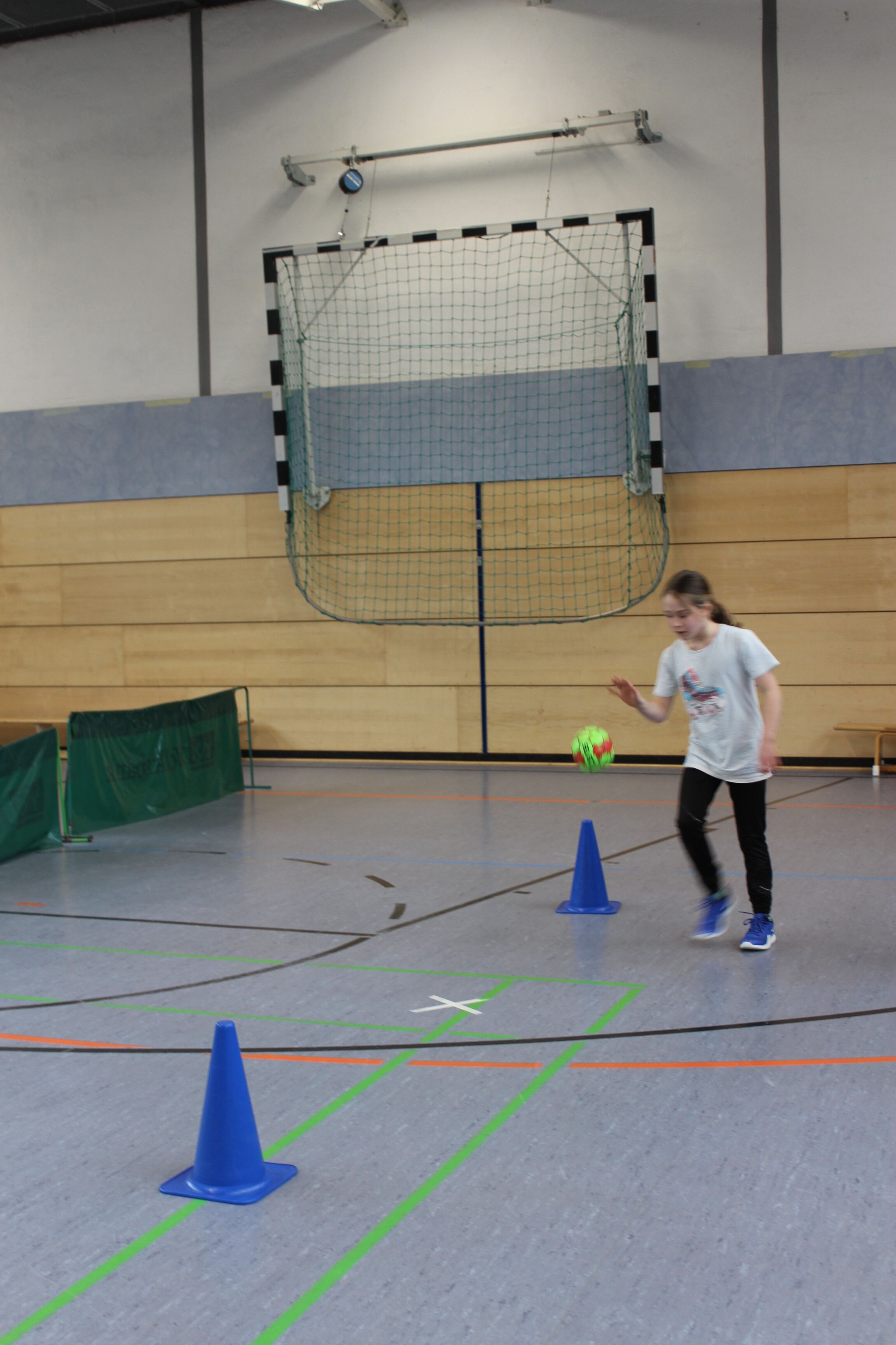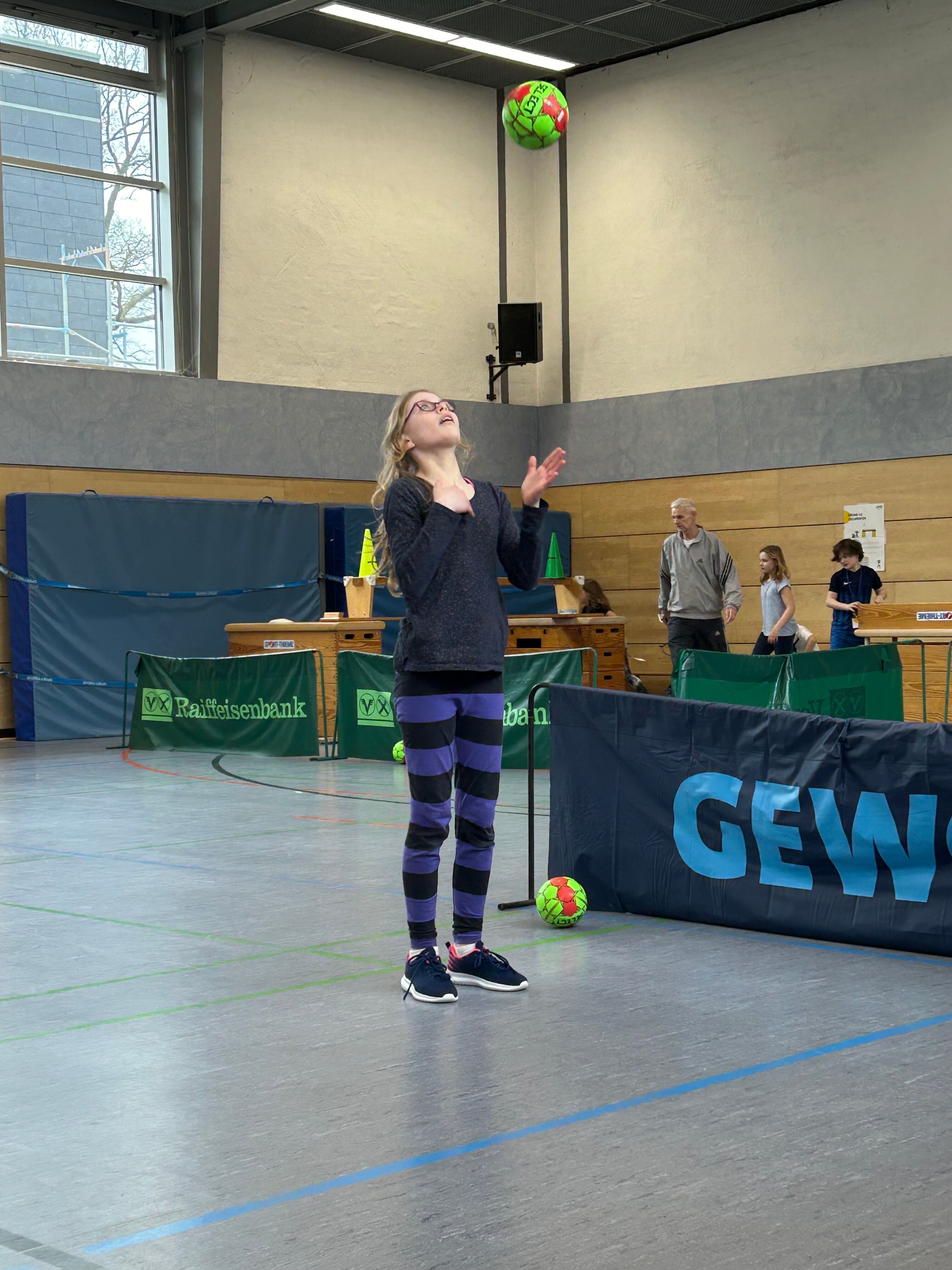 Die Kinder absolvierten in ihrer Klasse in einer Sportstunde vielseitige Übungen mit einem Handball. Da mussten Hütchen mit dem Handball abgeworfen werden. Der Ball musste in unterschiedlicher Laufbewegung transportiert werden. Es wurde geprellt, hochgeworfen (dabei geklatscht) und wieder aufgefangen und es wurden Abpraller von einem kleinen Turnkasten aufgefangen.
