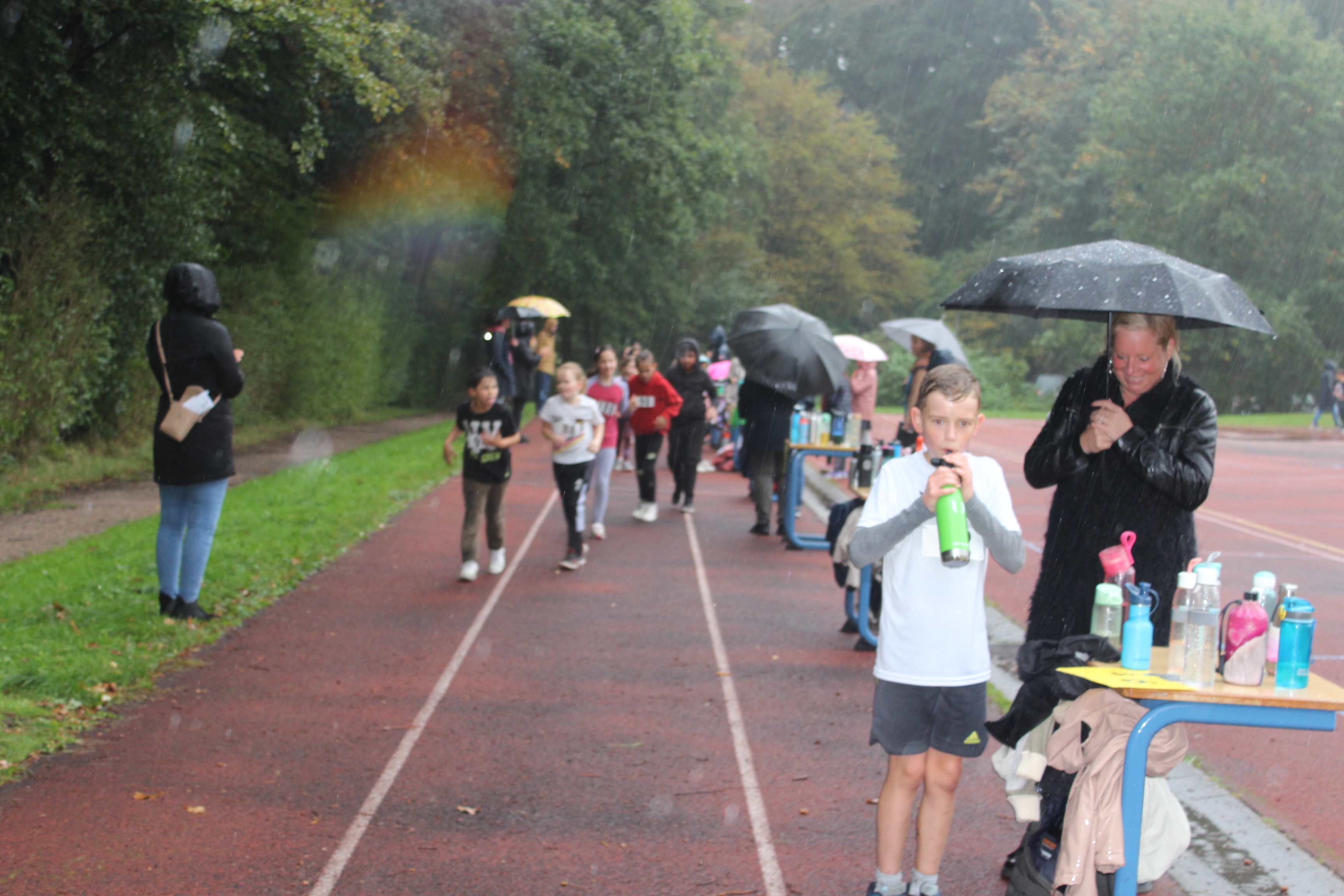 In diesem Jahr war die Herausforderung schon besonders, weil mit zunehmender Dauer der anfängliche Nieselregen sich zu einem dichten, schaurigen Regen auswuchs. Während die ersten und zweiten Klassen nach ihrem Lauf bereits im trockenen Klassenraum sitzen konnten, drehten die Kinder für die 60min nun schon im strömenden Regen ihre Runden. Sie haben sich das Laufabzeichen besonders verdient.