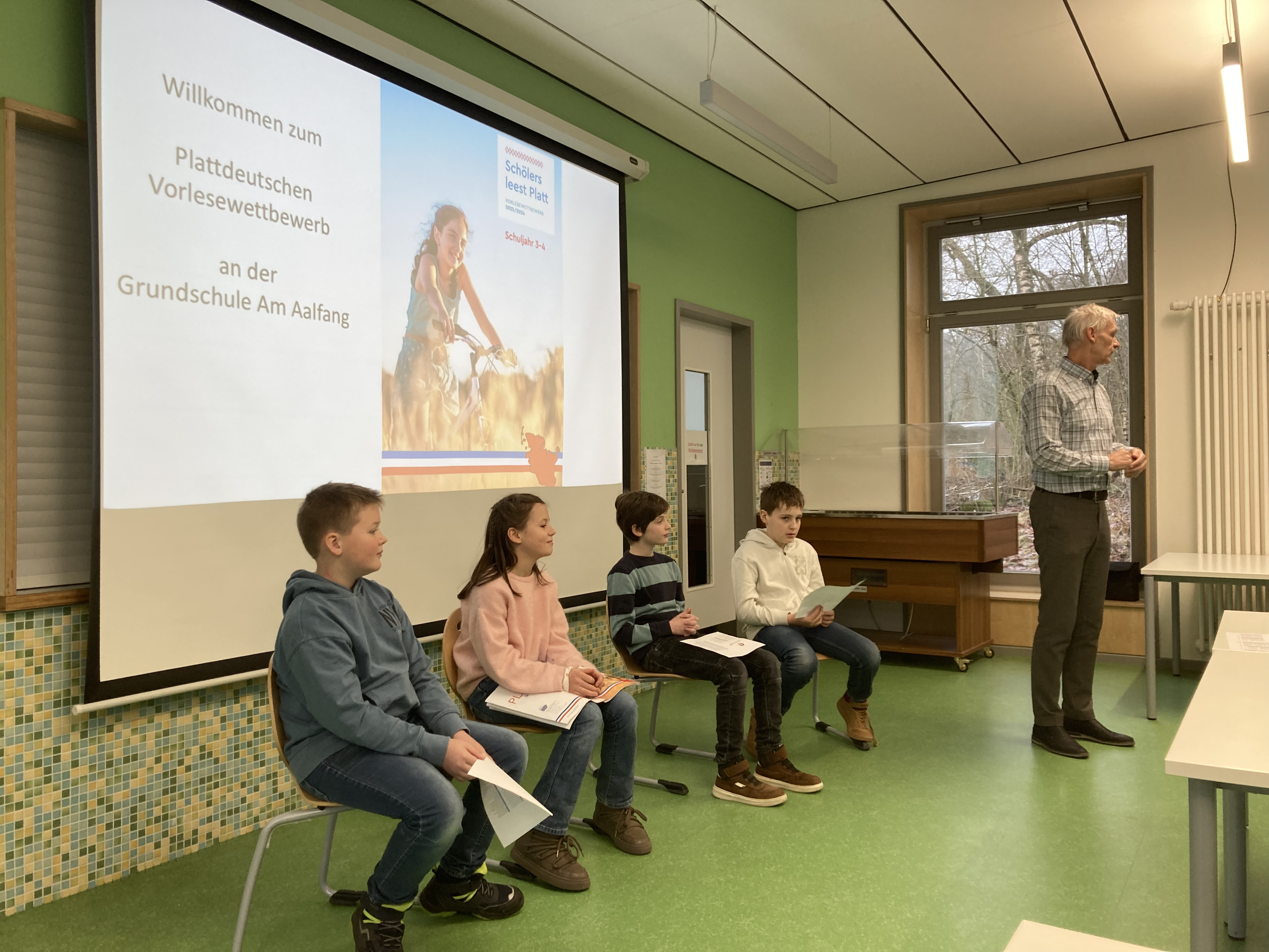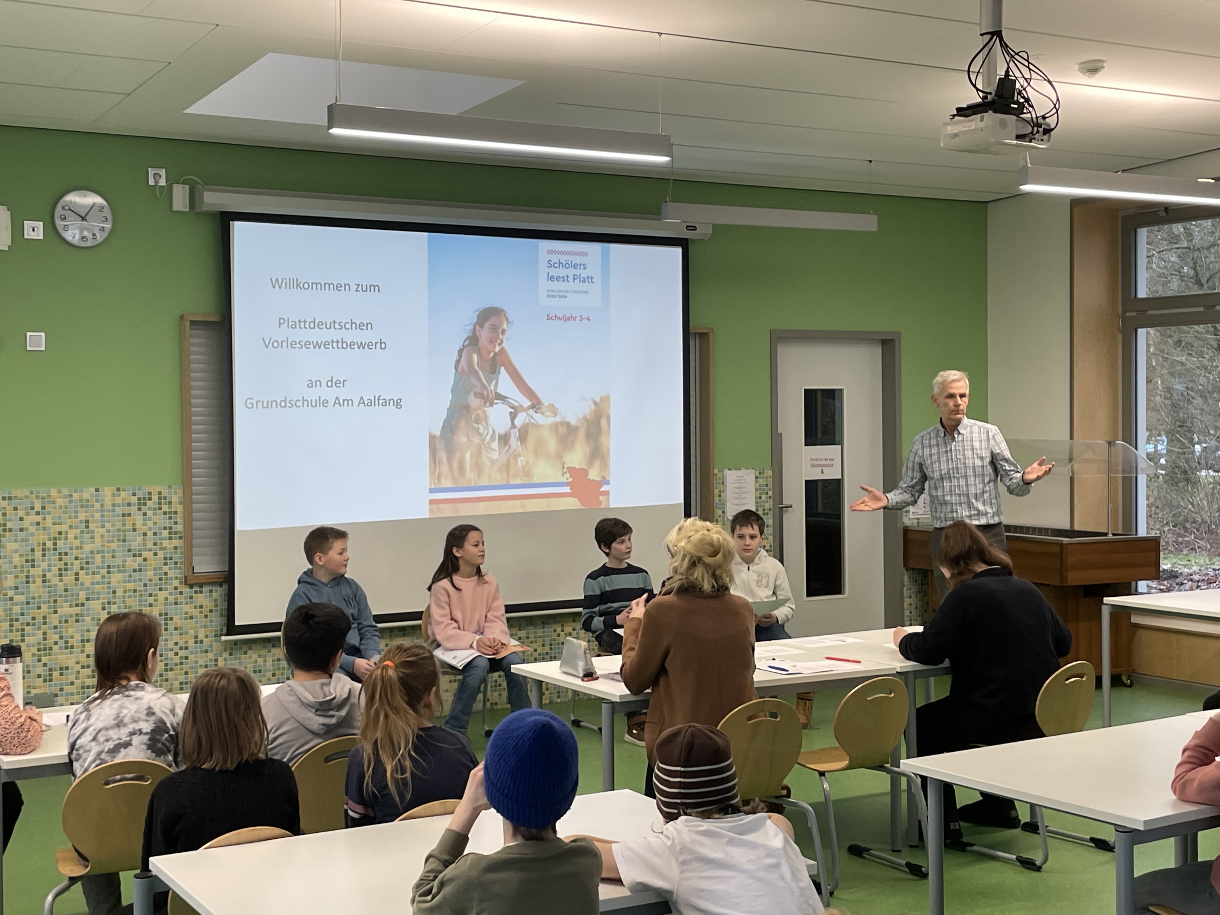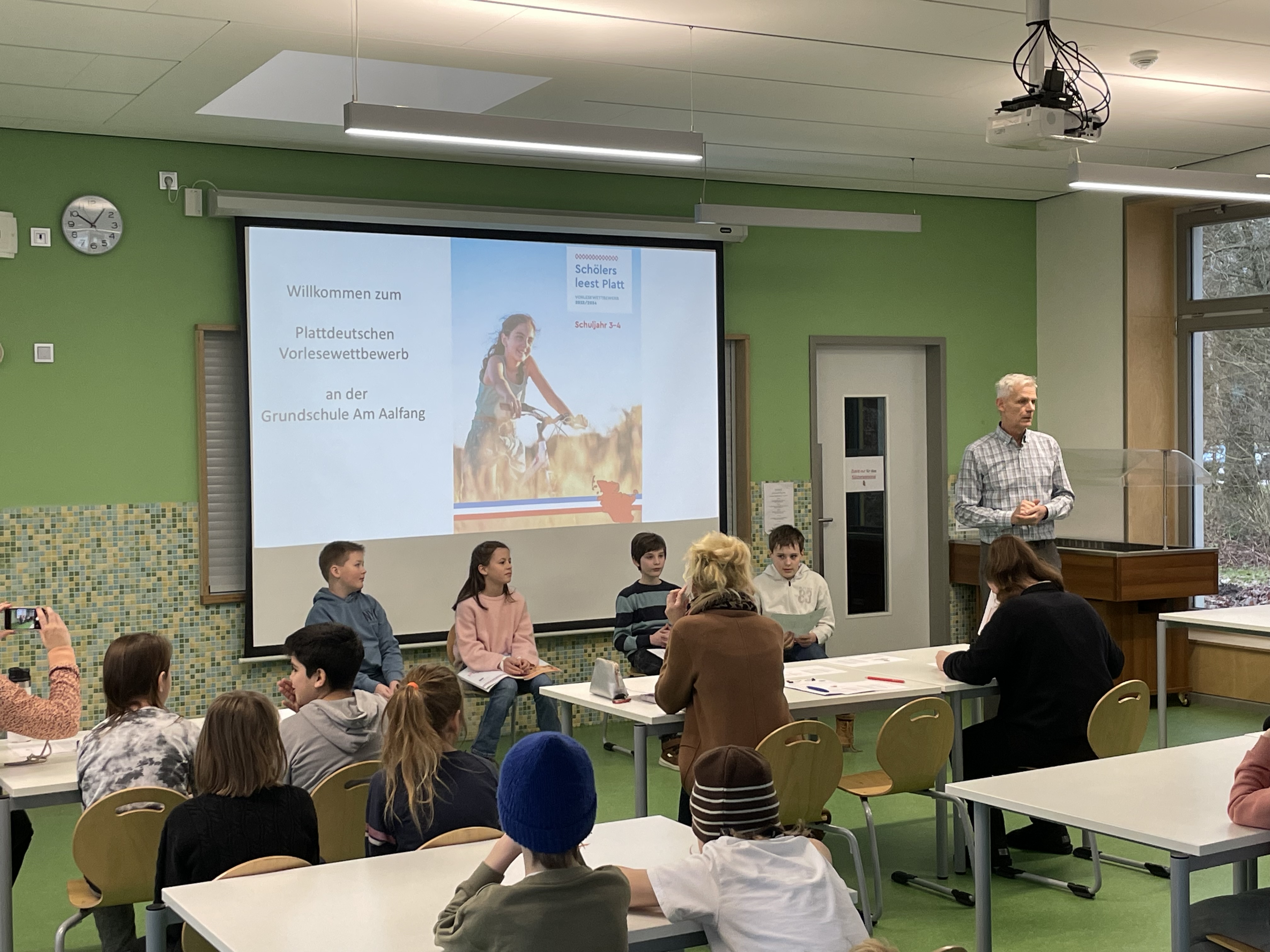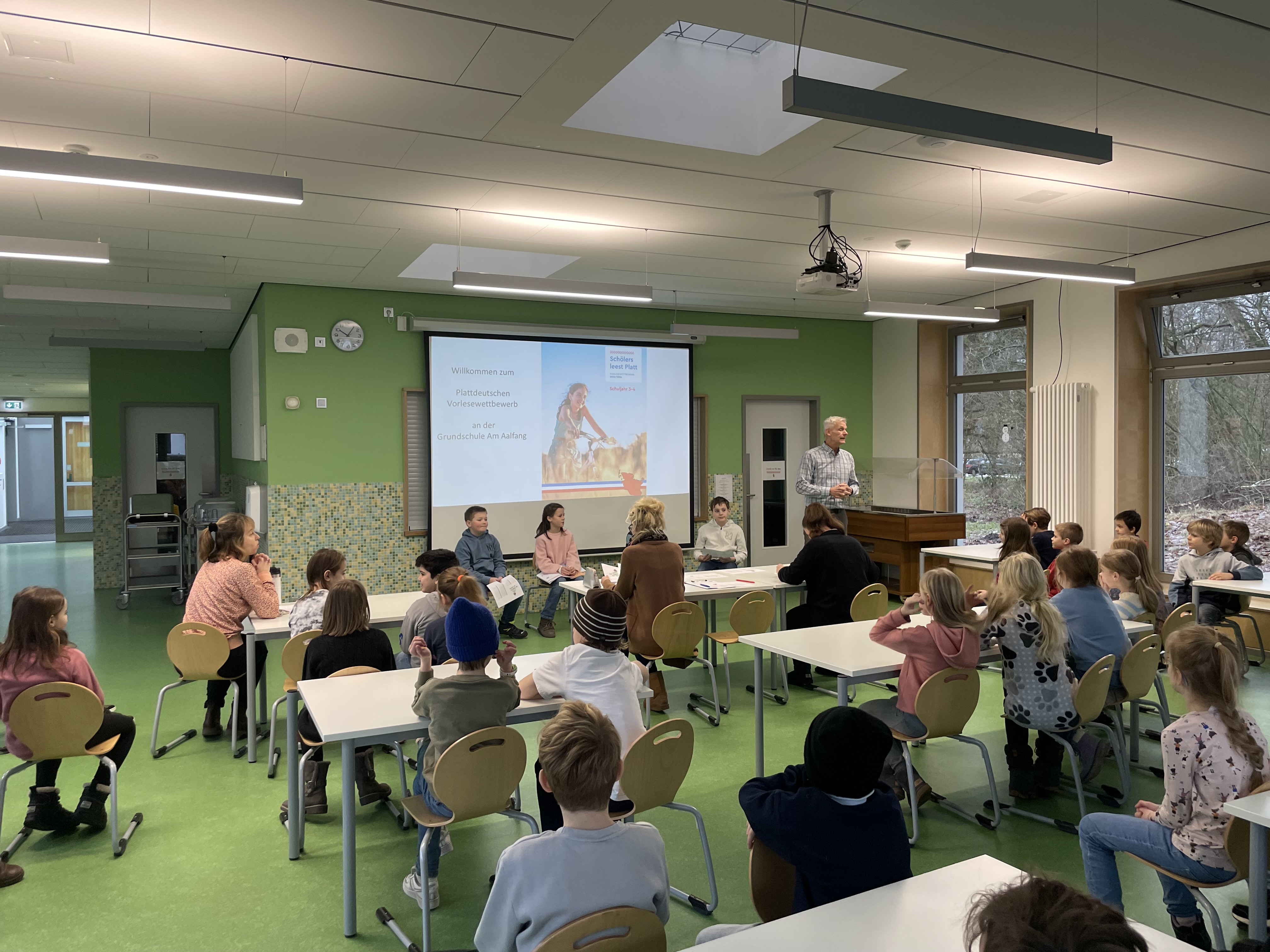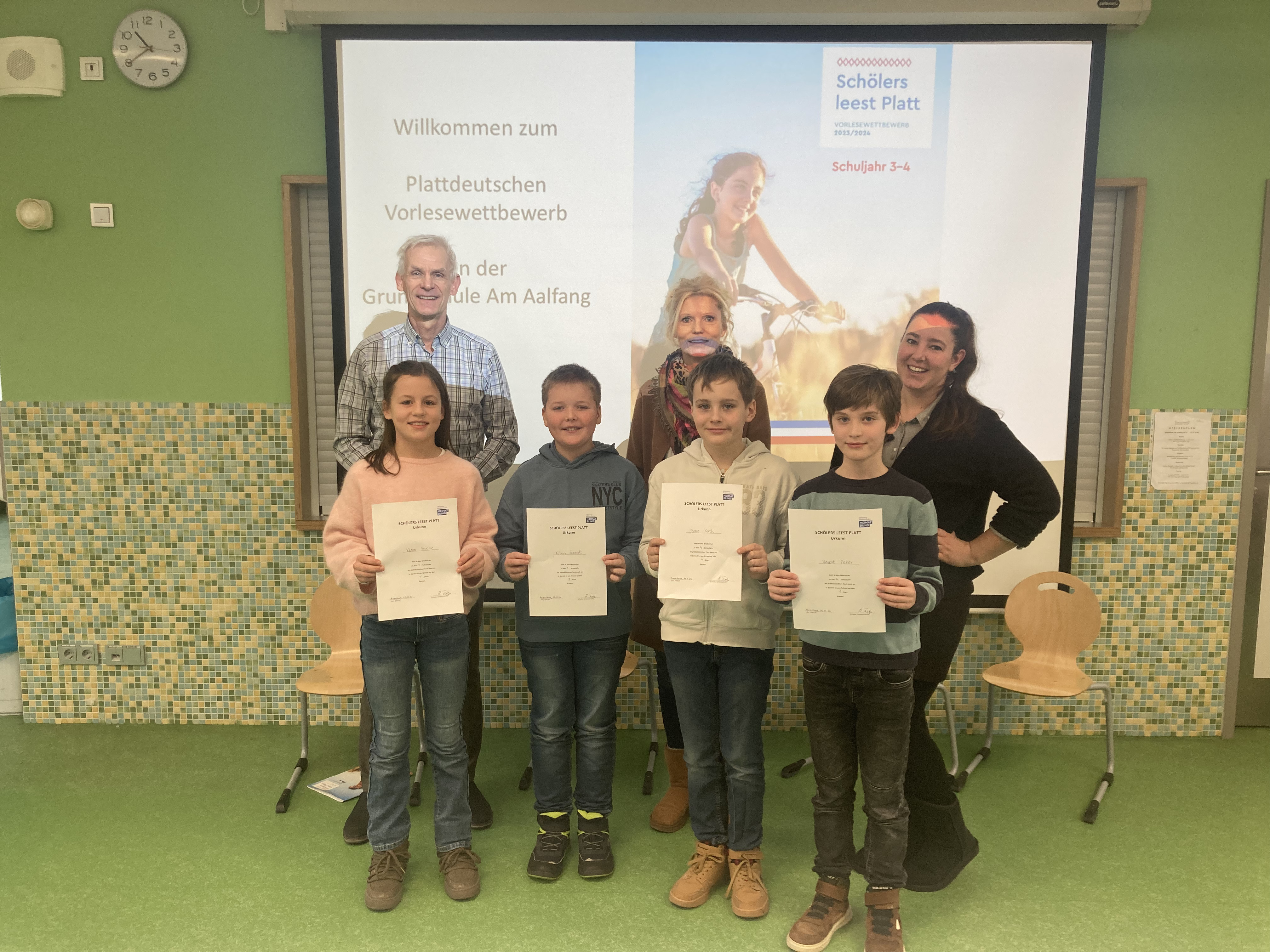 Vier Kinder aus der Klasse 4a haben sich vor einiger Zeit dazu entschlossen am diesjährigen Plattdeutschen Vorlesewettbewerb teilzunehmen. Die Kinder übten ihre Vorlesetexte fleißig für den Schulentscheid. Am 15. Januar war es dann so weit: Fabian, Klara, Vincent und Yannis traten gegeneinander an. Dafür wurden die 3. Klassen und die Klasse 4a in die Cafeteria eingeladen. Die Jury bestand aus Frau Lindmüller, Frau M. Roth und Herrn Tietze. Die Jury vergab nach jedem vorlesenden Kind Punkte auf einem Jurybogen und das Publikum applaudierte. Am Ende wurden alle Punkte zusammengerechnet, dabei gab es eine große Überraschung: Durch einen Zufall, erlangten zwei der Kinder dieselbe Punktzahl! So belegten Klara und Vincent beiden den ersten Platz! Fabian wurde dritter und Yannis belegte den 4. Platz. Herzlichen Glückwunsch an alle der teilnehmenden Kinder! Für Klara und Vincent geht’s nun im Februar oder März in die nächste Runde. Das große Landesfinale findet am 05. Juni 2024 in der Niederdeutschen Bühne in Neumünster statt. Es heißt also weiterhin Daumen drücken!